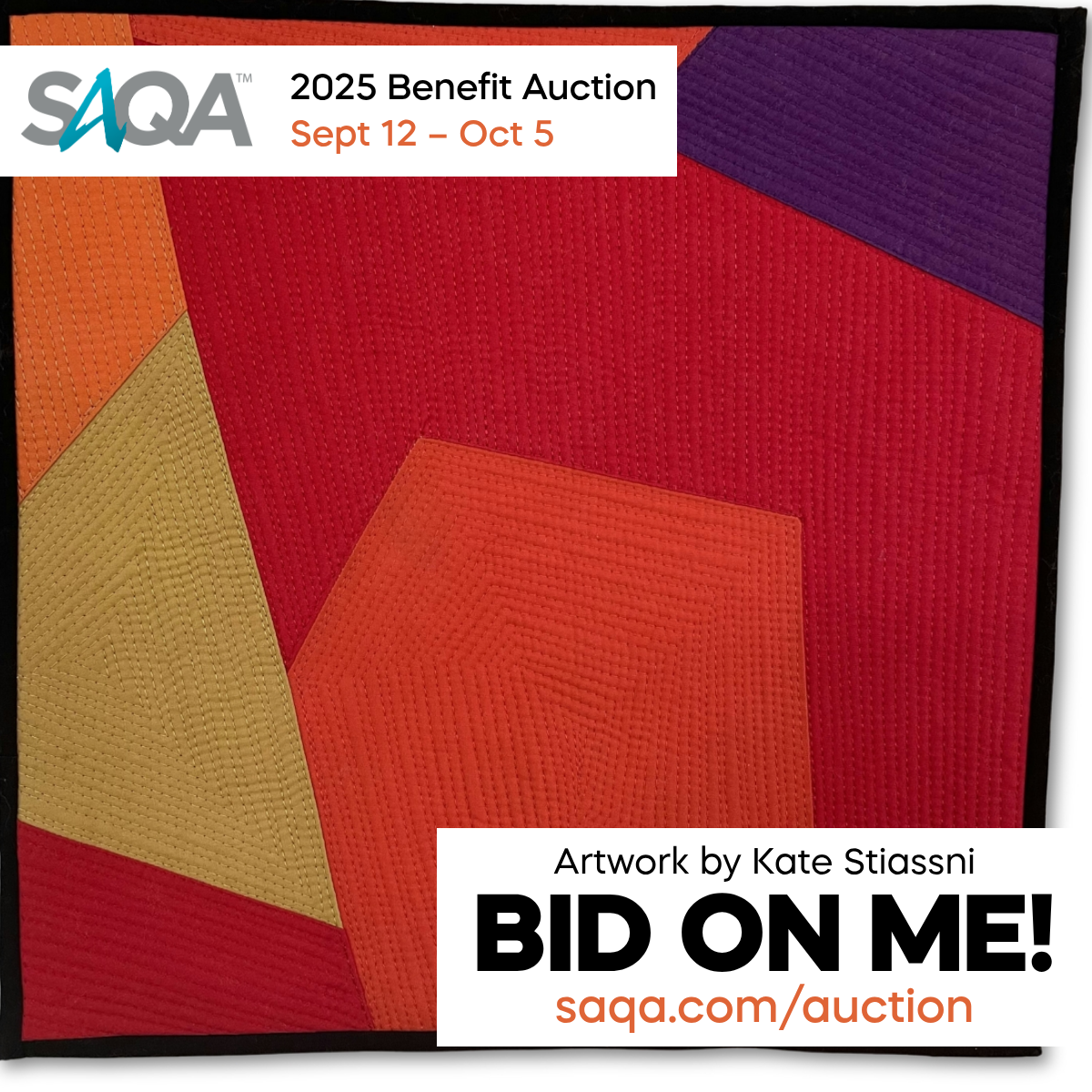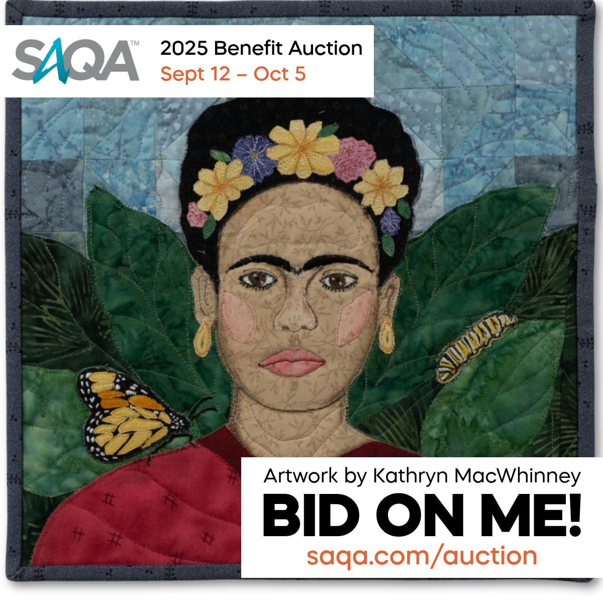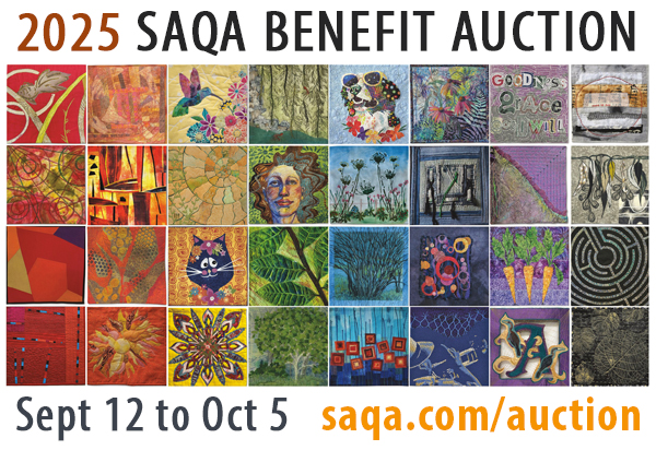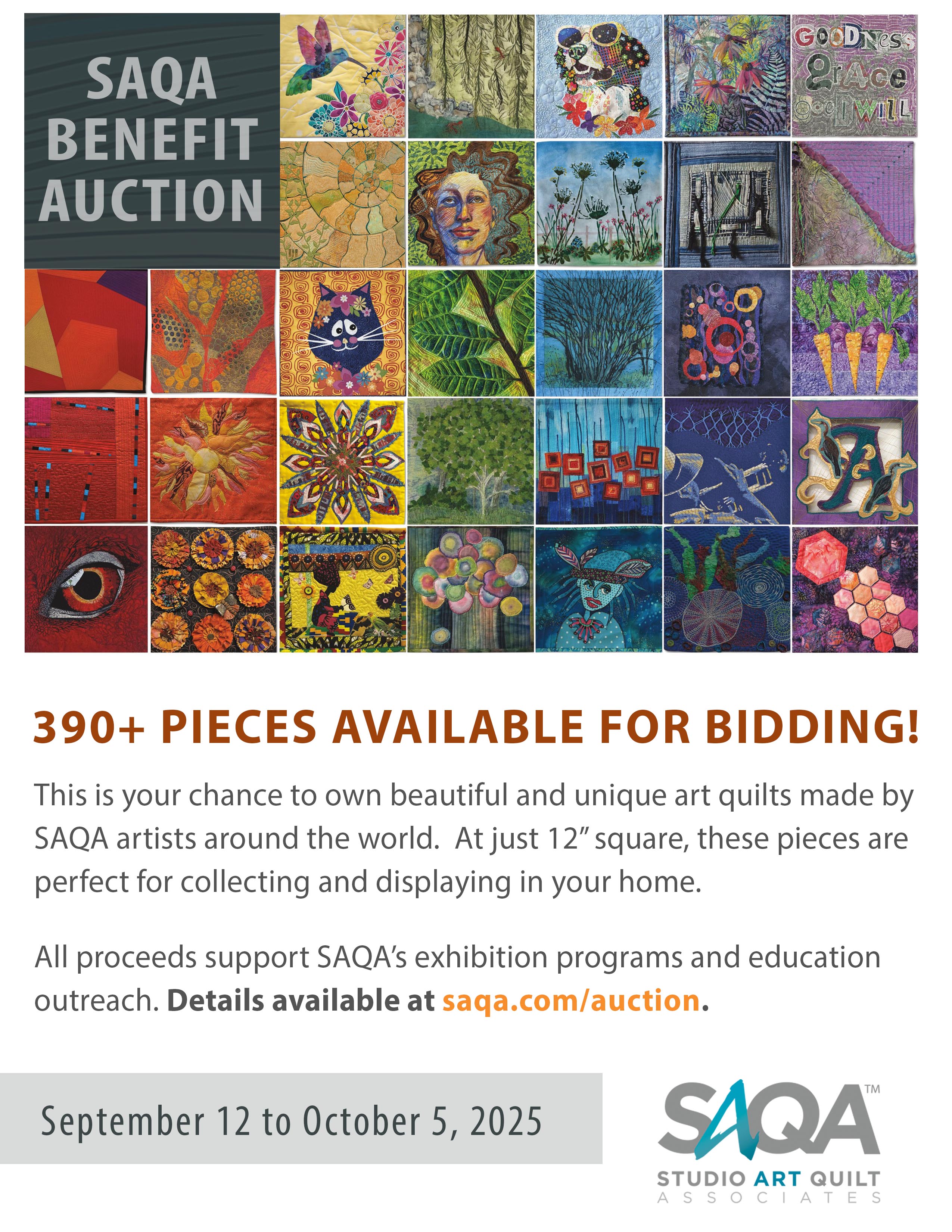 SAQA's annual Benefit Auction will take place online from September 12 through October 5, 2025. With almost 400 pieces of beautiful artwork available for bidding, there is something for everyone to enjoy!