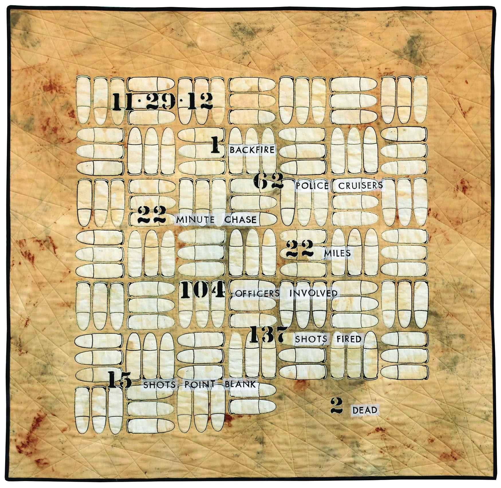 Timothy Russell and Malissa Williams lost their lives on November 29, 2012. Russell sped away from a Cleveland police officer who had attempted to pull him over for a traffic violation. The ensuing chase ended in a school parking lot, where police officers shot 137 bullets at the pair trapped in the car. They claimed gunfire emanated from the car, but no gun was ever found. Malissa was shot 24 times and Timothy was shot 23 times. Their humanity was erased with the shooting. My quilt tabulates the bullet count that took their lives.