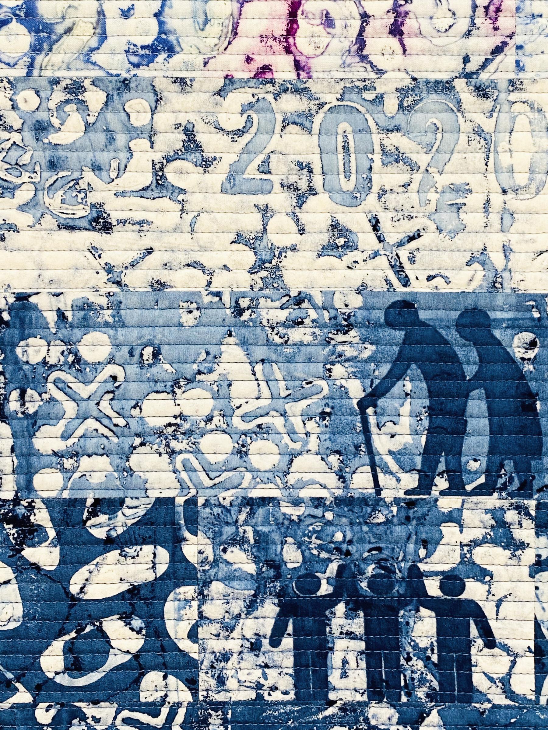 What a year 2020 was! This quilt is the result of my reflections on the social sacrifices made by individuals in order to stem the spread of the pandemic. Presented as a graffitied wall, it records some of the activities we take for granted until we have to forgo them.