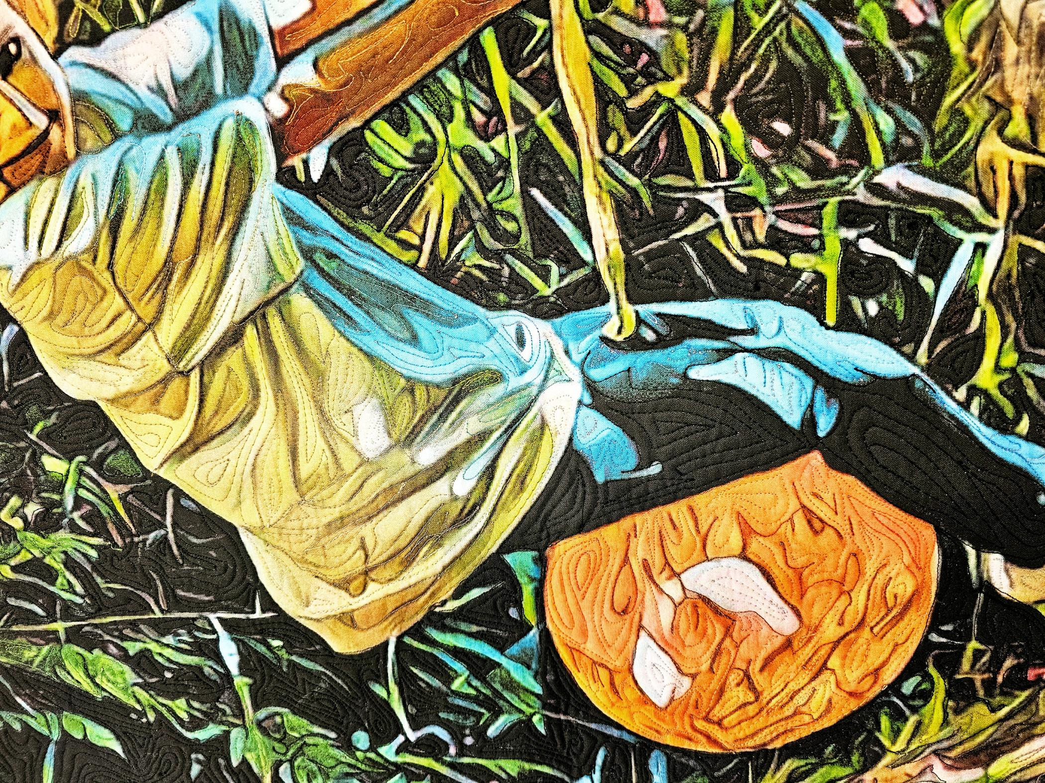 The photo was manipulated and printed on petal cotton at Spoonflower. It was free-motion quilted using over 30 colors of thread.
