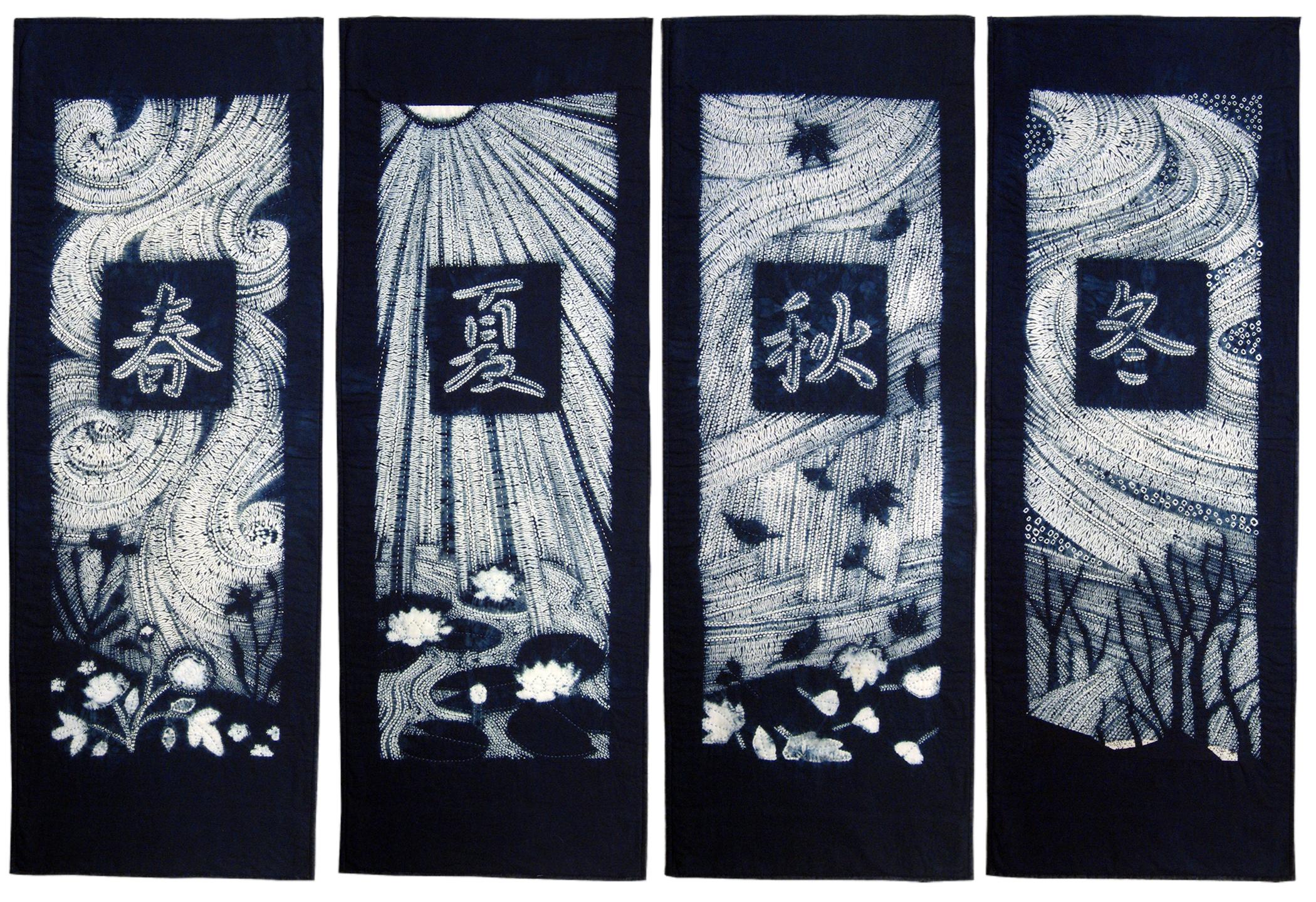 Indigo and shibori dyeing have been perfect partners since ancient times, each bringing out the best in the other. They are a wonderful resource for contemporary quilts, especially whole cloth designs. Inspired by the Japanese characters for the four seasons, these quilts are predominantly created by shibori stitch resist�the design is stitched, gathered tightly, & dyed. The stitches are removed to reveal the design and then more stitches are added as the panels are quilted. The fifth season is New Years.