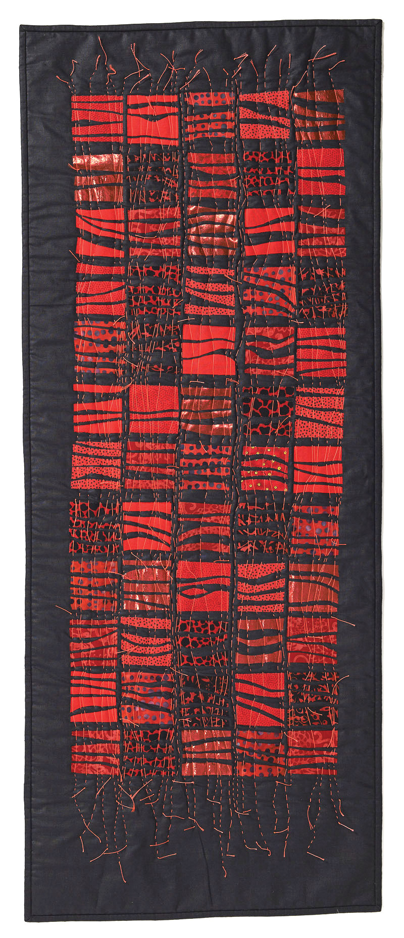 Cottons including commercial prints, hand dyed and commerical hand-dyed-look-alikes, lame, polyester threads, wool batting.
