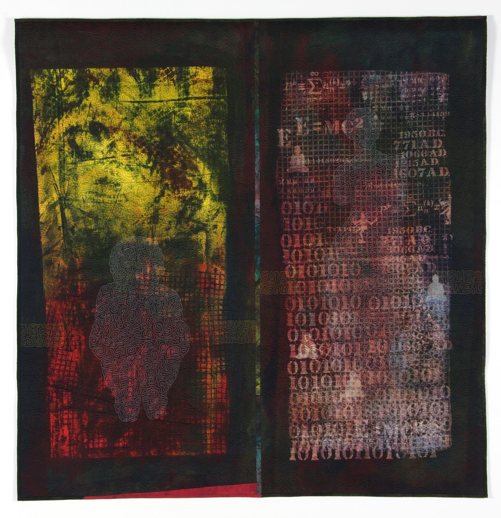 The more I worked with dye, the more painterly I got with its use. During the early 2000's I experimented with a lot of abstractions. The two figures are articulated all in free motion quilting (yes, I sew on a Pfaff.) The figures of Venus de Willendorf and Venus de Milo were outlined in fabric washout pencil before I began quilting. This quilt is part of a series contrasting two archetypal women: earth mother vs. the classical refined figure.
