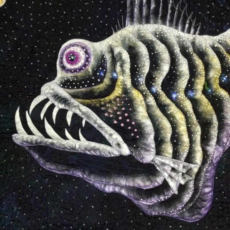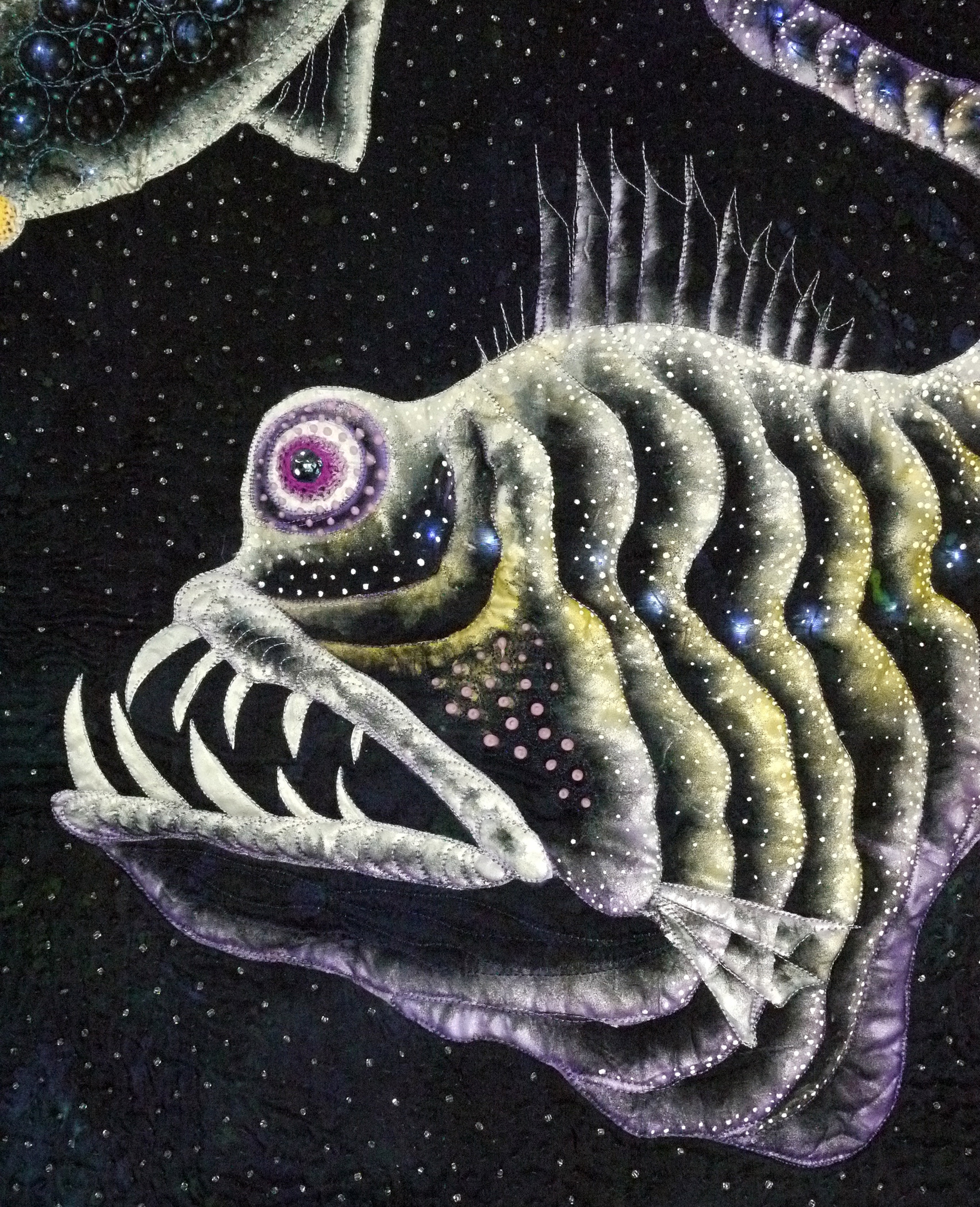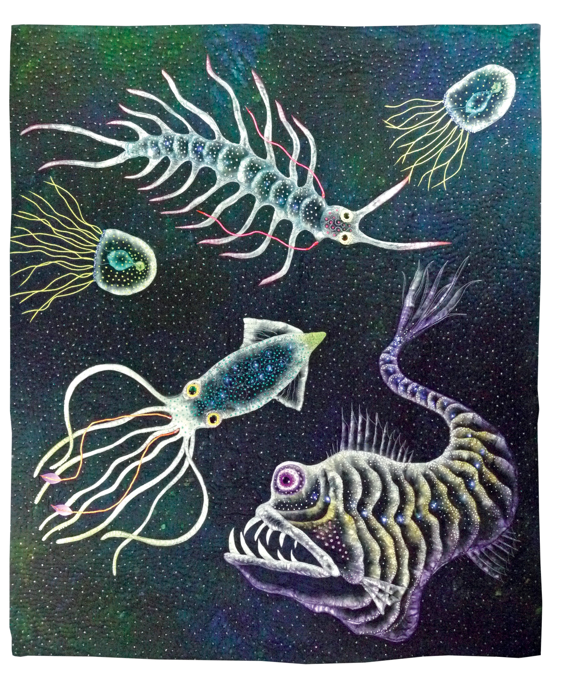The mystery of the deep is evoked with this collection of extraordinary creatures. Created on artist-dyed silk with stenciled oil stick, the pieces are accentuated with hand- couched cording and glass eyes. The background is hand stitched with hundreds of clear glass beads.