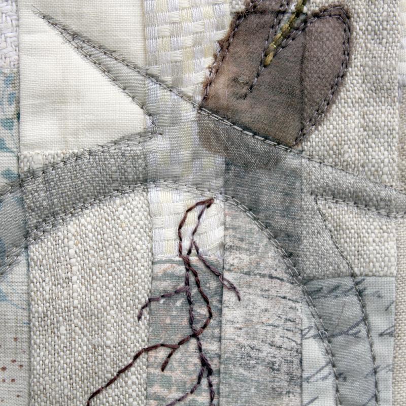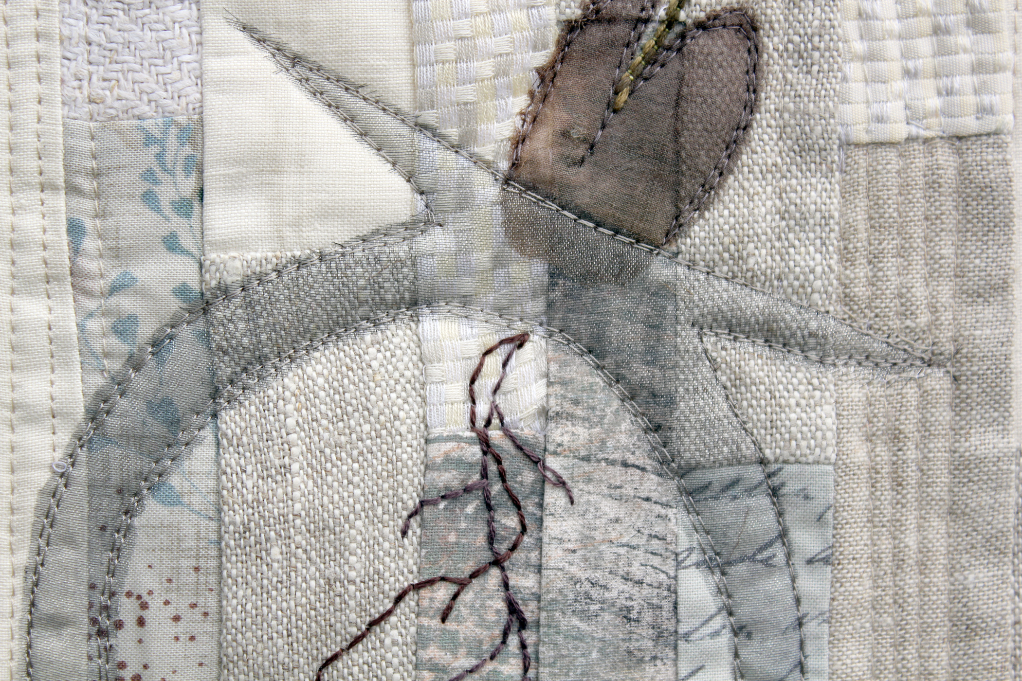Pieced stripes of cotton, linen, silk. Machine stitched raw edge appliqués made from synthetic organza, home dyed silk and damask. Hand embroidery, machine quilted. Cotton batting, synthetic backing.