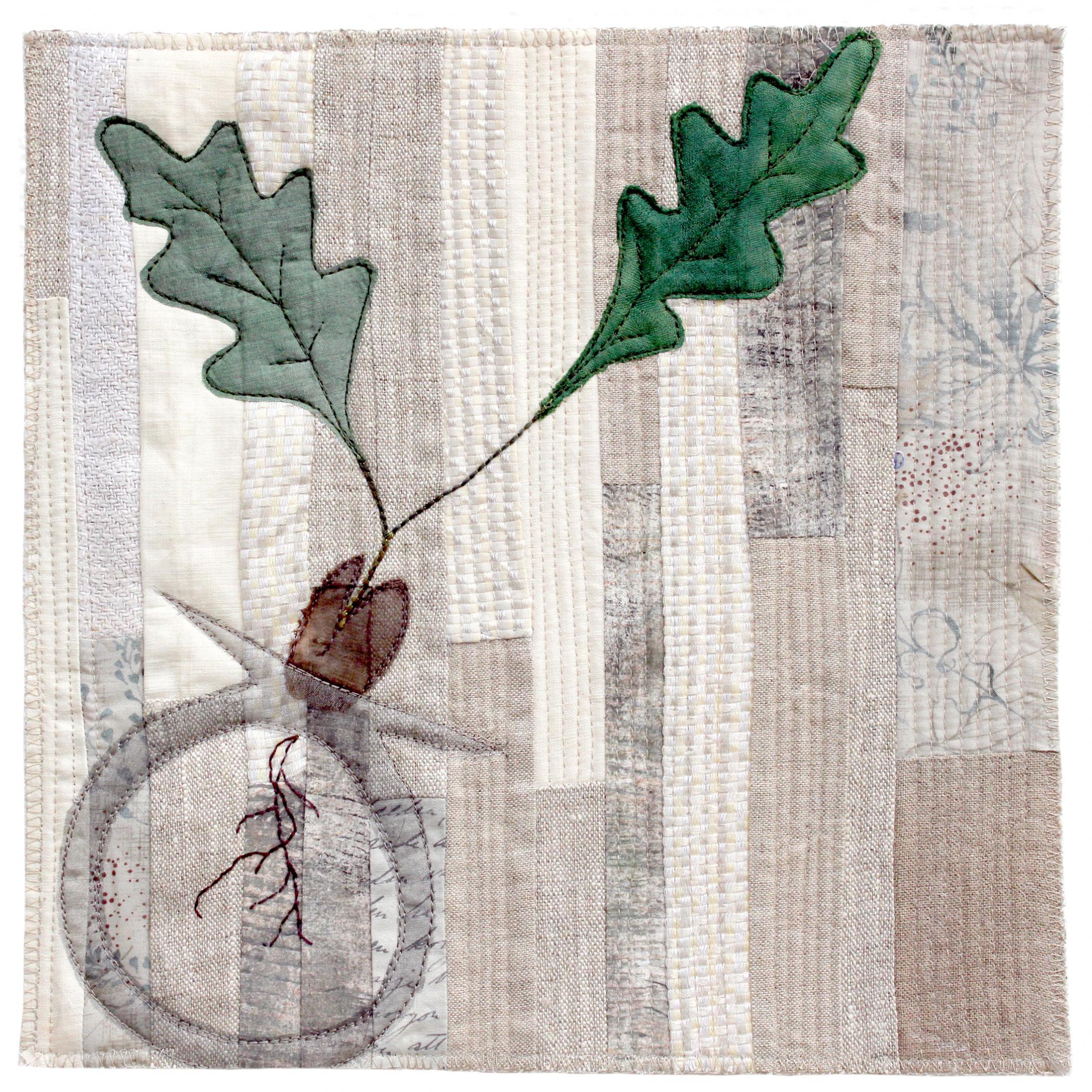 When I grew up my family lived in a house built on a slope of oaks and oak has always been a worshipped tree for me. Where I live today these trees are infrequently seen and when I find an acorn I love to put it in a tiny vase to see it grow. My acorn is a voice from the past to the present, growing in a transparent vase with a backing symbolizing timber.