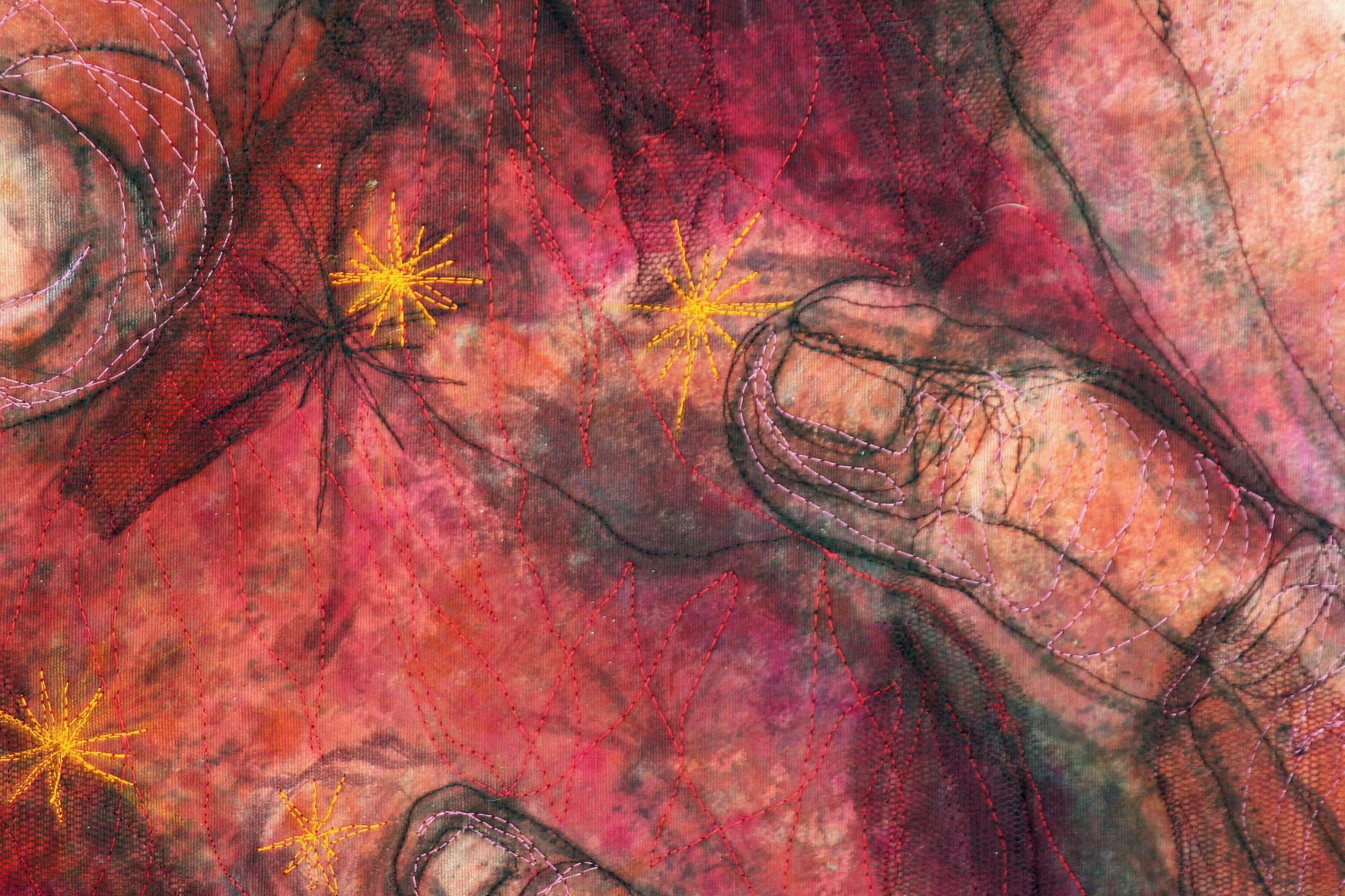 Hand drawn and painted, layered fabric collaged, free motion quilted