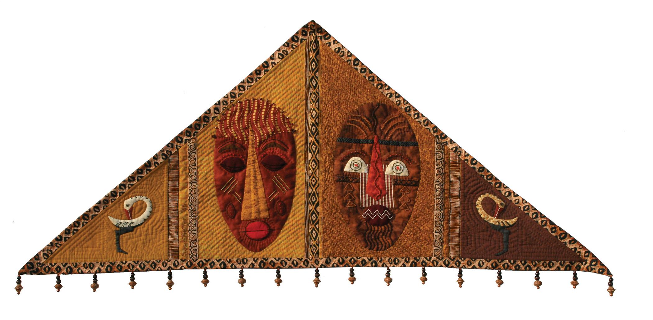 Always fascinated by the many ways different cultures call upon nature and the spirit world to bring about good fortune and other desired benefits, I've spent many creative hours reimagining African masks. Inhabiting this triangular, quilted architectural form are two each of appliqu�d and hand-embroidered African-style masks and egrets.