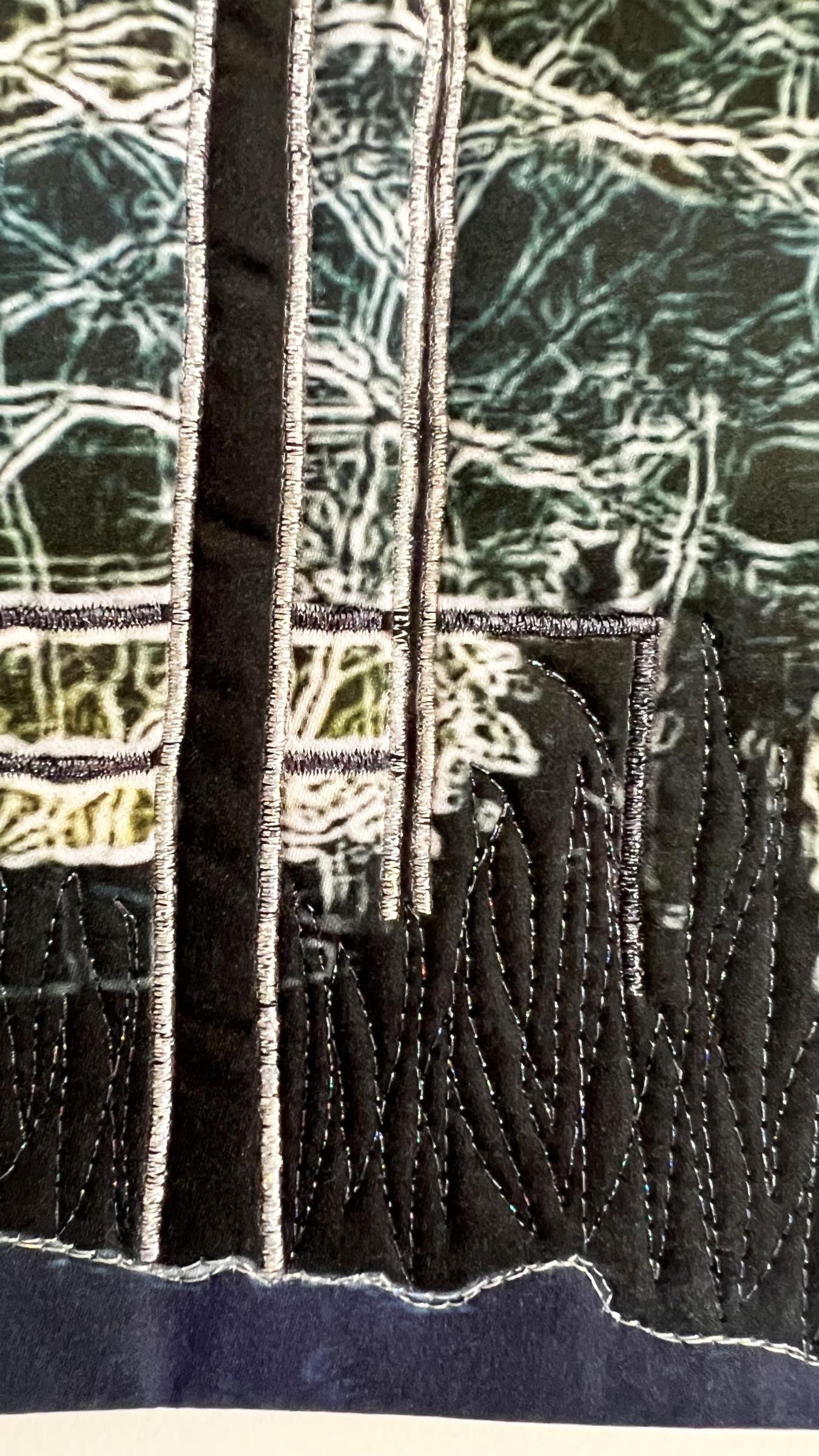 Blue with cold. Alaska in winter is a perfect illustration of the concept. I often visited my mother in Alaska during winter. Bundled up so only my eyes were visible, fighting the cold, I would try to get in a bit of a walk. I captured the source photo for this quilt on one such walk. The silver threads outlining the bare trees represent frost rimmed along the branches, while the sinuous lavender lines in the sky represent the aurora borealis.