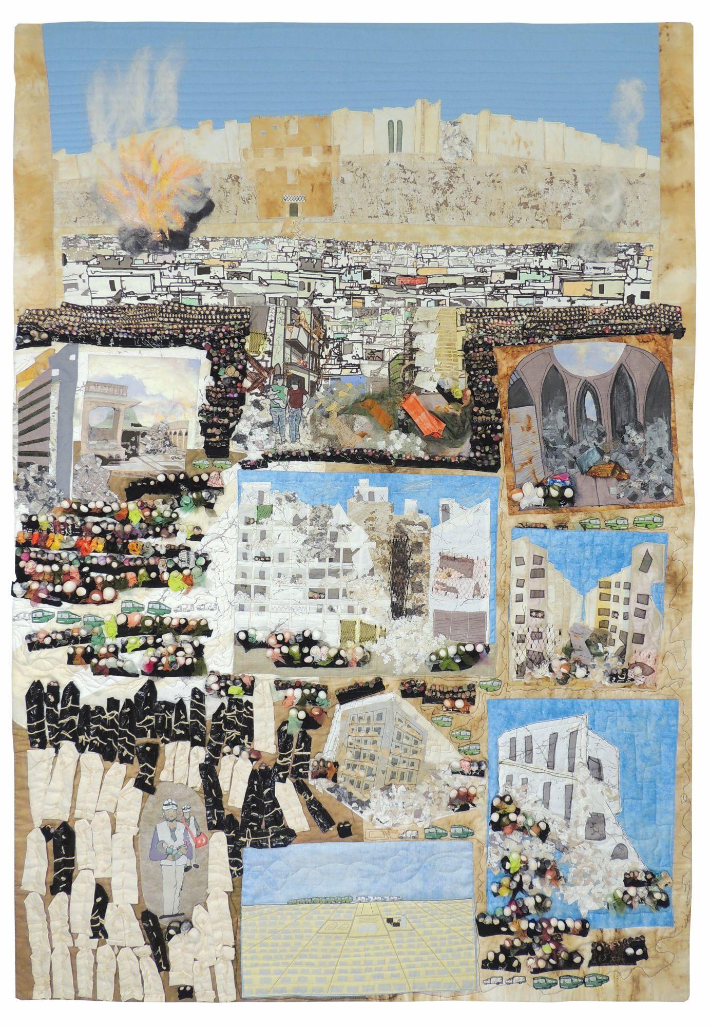 This lovely, ancient hub of the Silk Road has been shattered—children murdered, grandchildren starving, growing up without schooling, family, and laughter. Millions camp abroad, helpless to stop this cataclysm. My piece shows people fleeing, hurrying to fleets of green buses that will carry them to bleak tent camps in Turkey, Lebanon, Jordan, Egypt, Greece, and elsewhere. Once a city of six million people, five thousand now leave Aleppo daily.