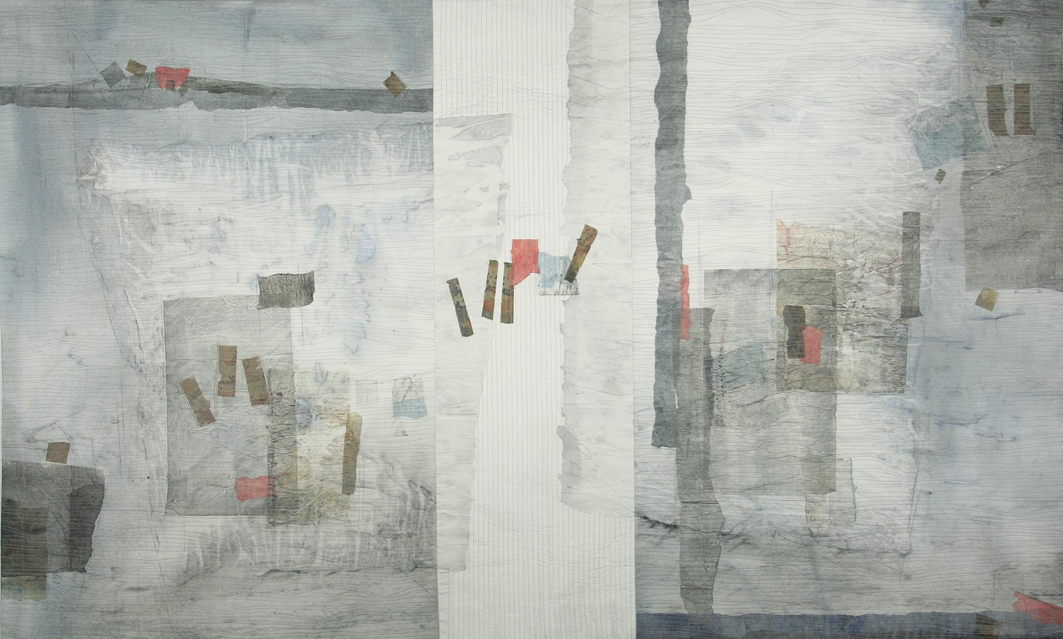 Alike But Not the Same III is one of a series where I combine two abstract images into one piece. Each side of the quilt compliments the other in color and technique but the two are not the same in design. The base fabric and pieces of archival tissue were first painted separately with transparent watercolor. Then I added a near-white center section and played with the collage pieces until I found a design that said, "this is it." After refining the design, I fused the collage, added more paint where needed and quilted. Working in my studio painting and quilting is an almost daily part of my life.