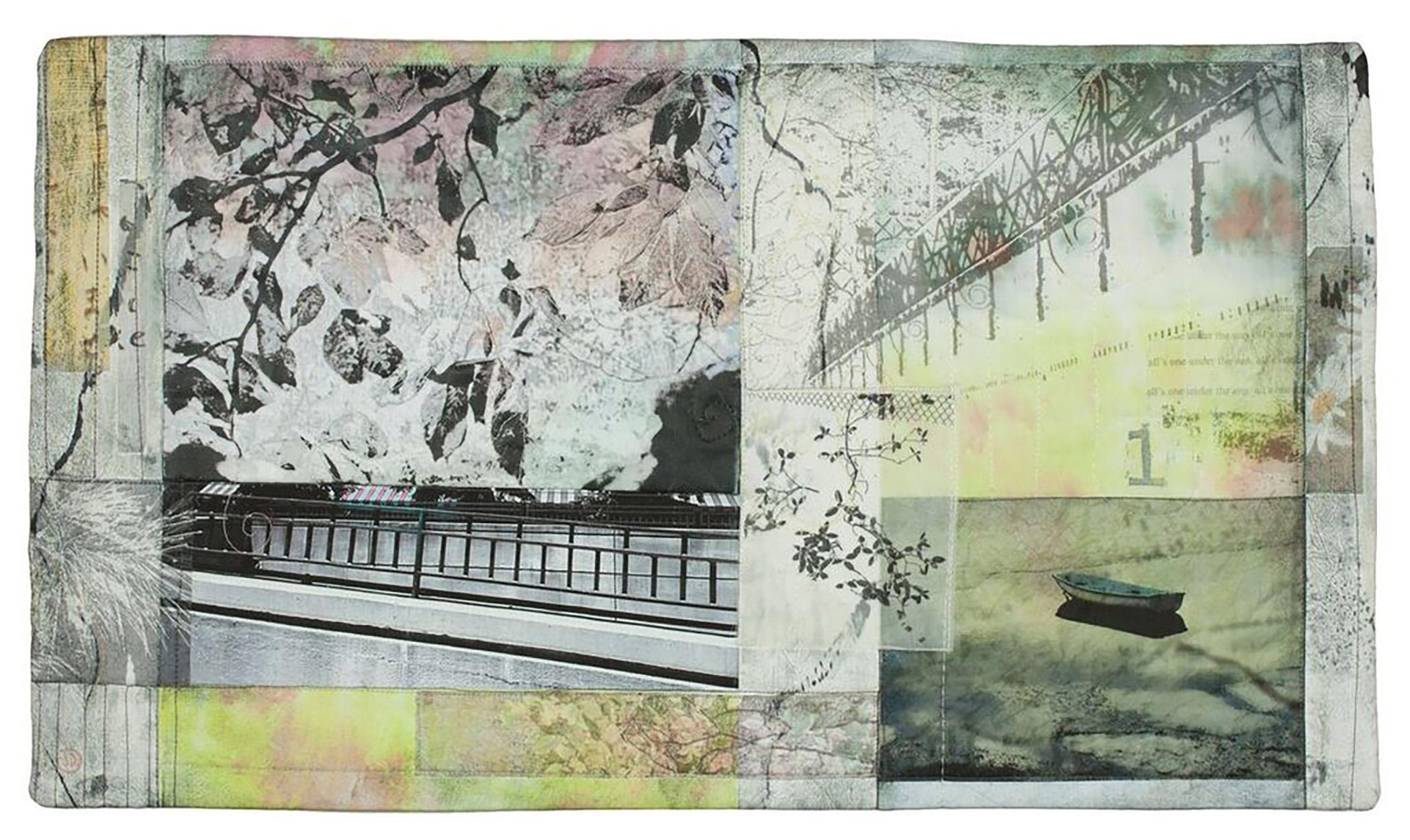 Just as the disparate photos hold together, they seem to merge naturally with my snow dyed fabrics and the straight lines of stitching echo the structural lines of the bridges and the swirling stitches flow with the natural curves of the branches and leaves, our entire existence of the natural and the invented is intertwined � each dependent on the other, each breathing in the wake of the other.