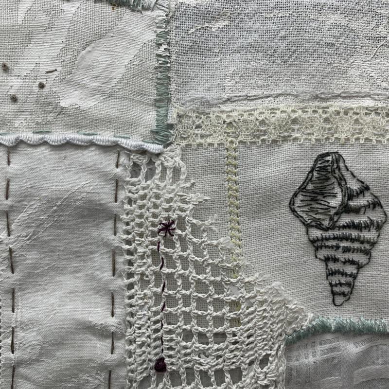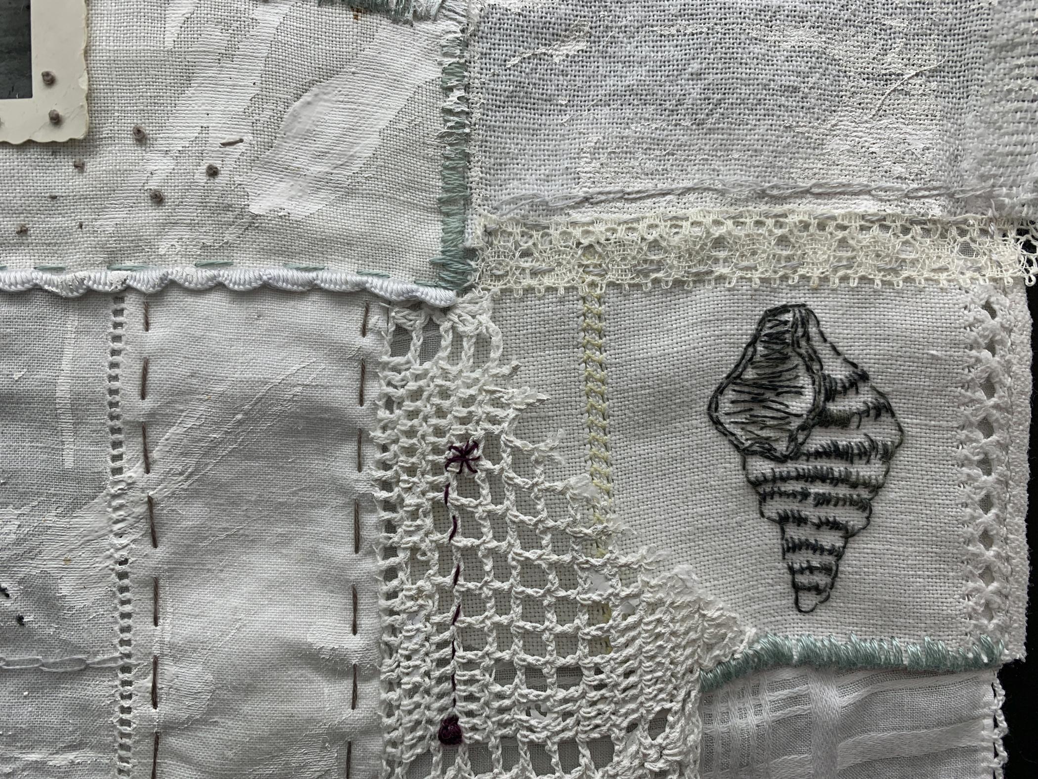 Vintage lace and linens, Hand-dyed cotton thread, Black and white photograph