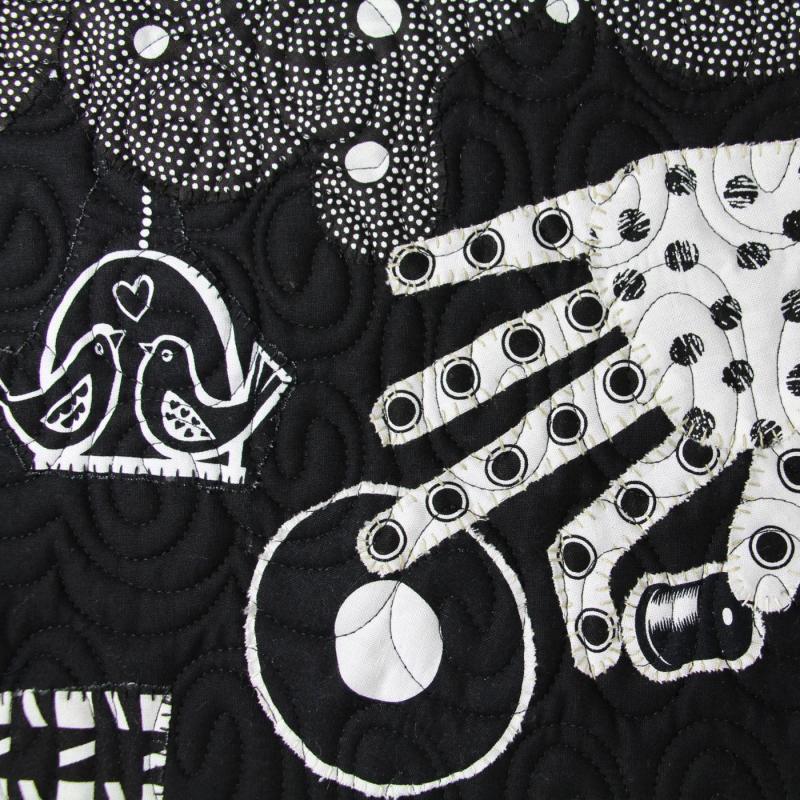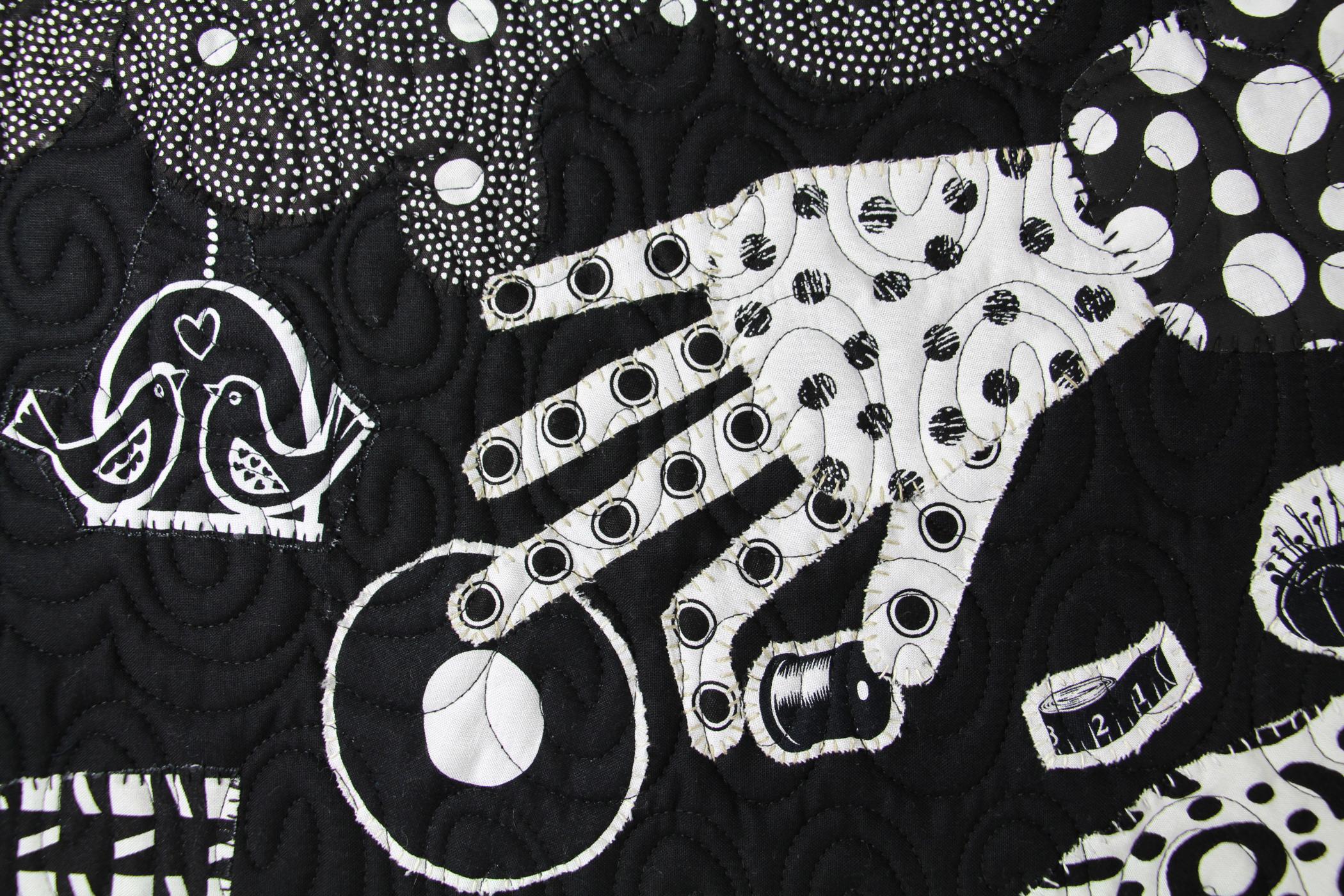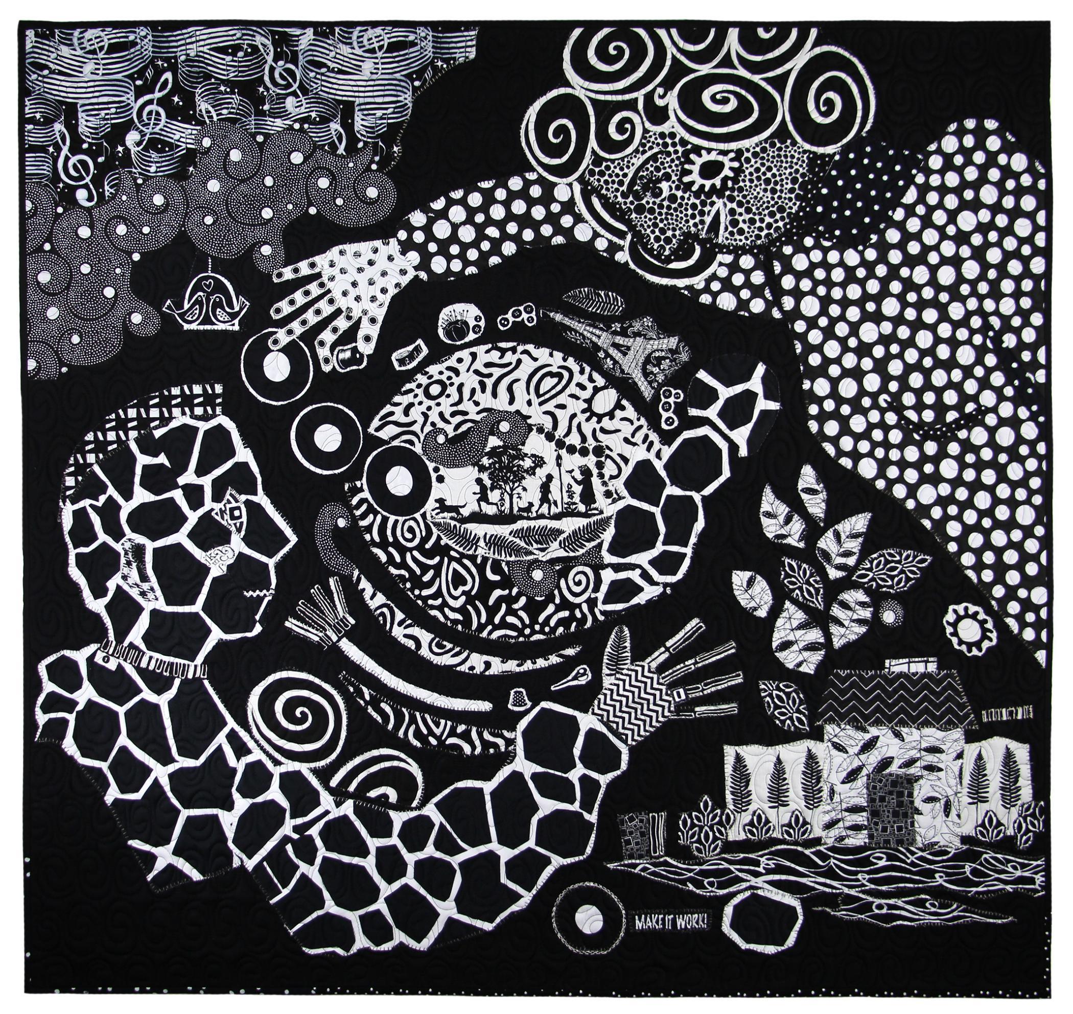 Marriage requires compromise. Two unique individuals must learn to coexist. This quilt represents me and my husband and our differences and commonalities. I love to travel; he is a homebody. I am an artist; he has no interest in art but prefers golf. He hates clutter and I have trouble parting with things. Although one is stubborn, rocky and down to earth, and the other is dotty and in the clouds, bits of us rub off on one another, and we generally get along well.