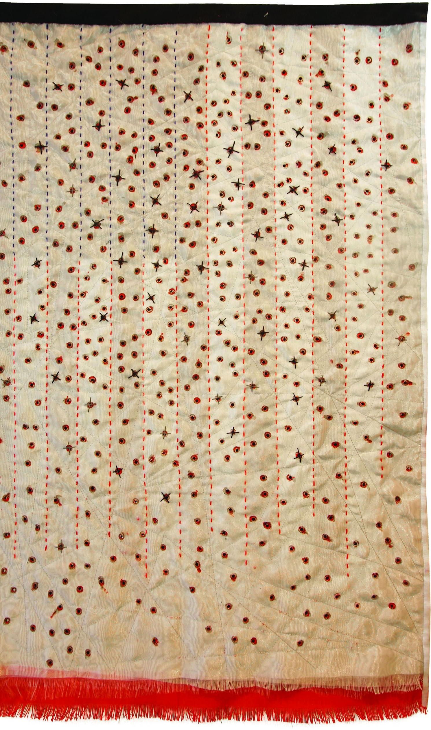 This piece is a meditation to the victims of the Las Vegas shooting. Over 500 burned and numbered holes represent the victims, with Xs standing for the 58 people who died. The stitching represents the chaotic paths of the crowd, and the red fabric showing through the holes is the blood.