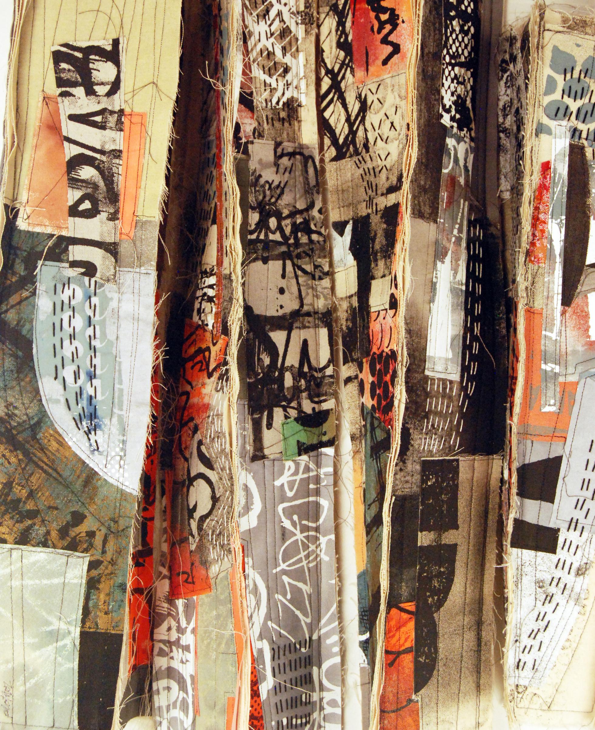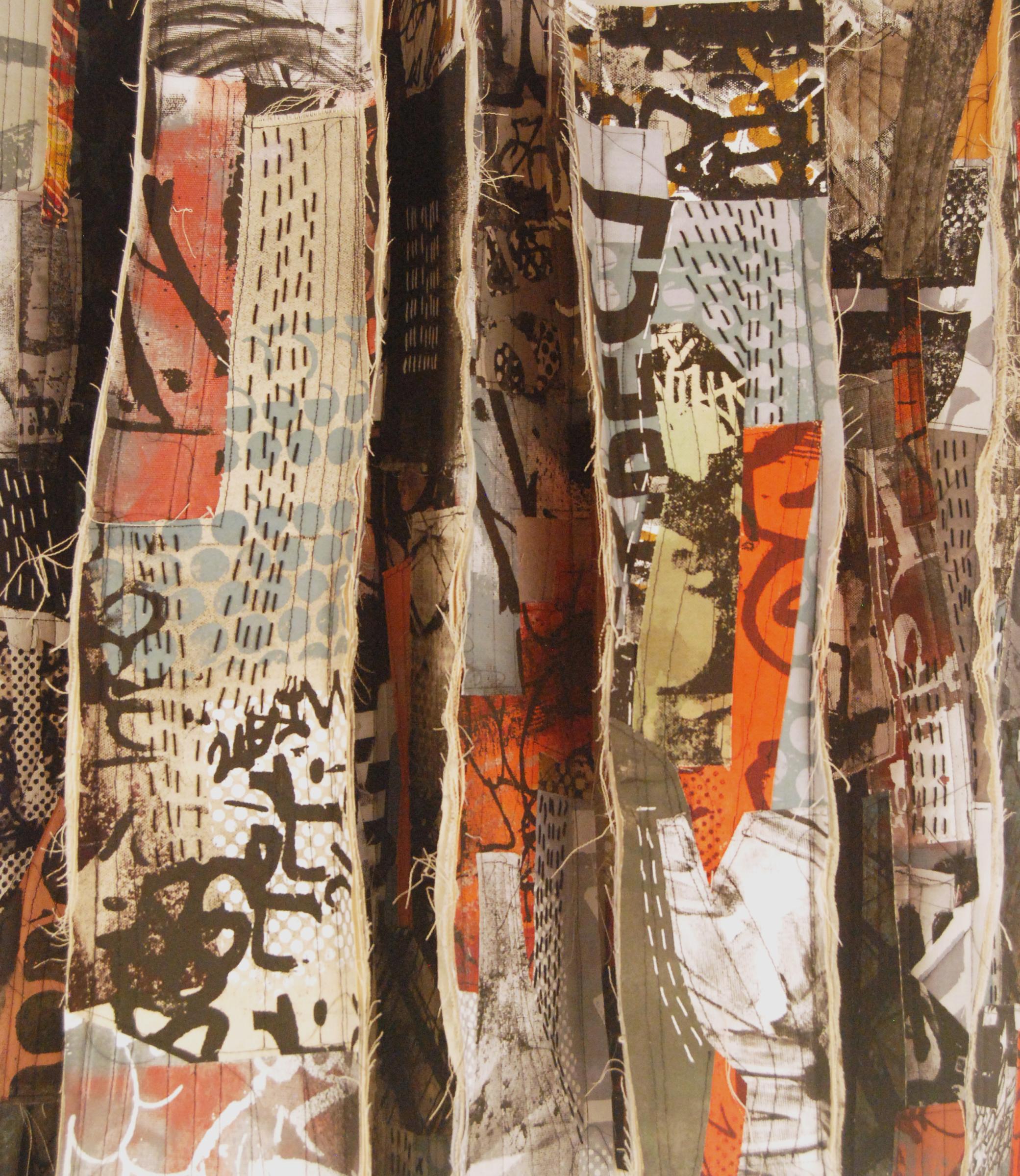 This piece is a series of monolithic forms, painted and printed with images of graffiti symbolizing today’s messaging and commemoration. They are manipulated to create interesting but not necessarily readable patterns, printed and overprinted, then cut up and collaged. With the use of black and grey for the ashes and reds for fire, the colors portray the chaos of today’s world. Unfortunately, they represent both natural disasters, like the fires exacerbated by climate change, and the fire, devastation, and disruption caused by hatred and war.