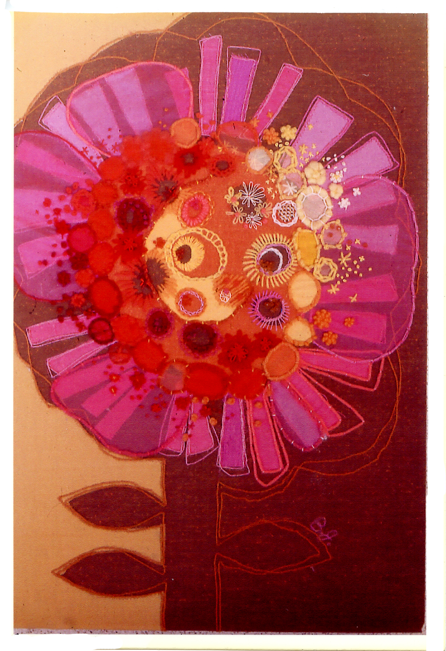This artwork was created for a friend when I lived in California. At that time the heavy yarns and bright Mexican or southwest colors were important and they also were perfect for the Dunn's home. I was enjoying the large yarns for hand embroidery but wanted to combine techniques so layered both fabrics and embroidery. At that time I must have been influenced by Jean Rae Laury's very large commissions and her art.