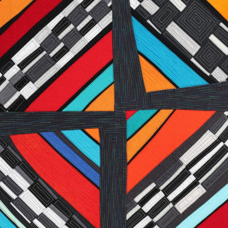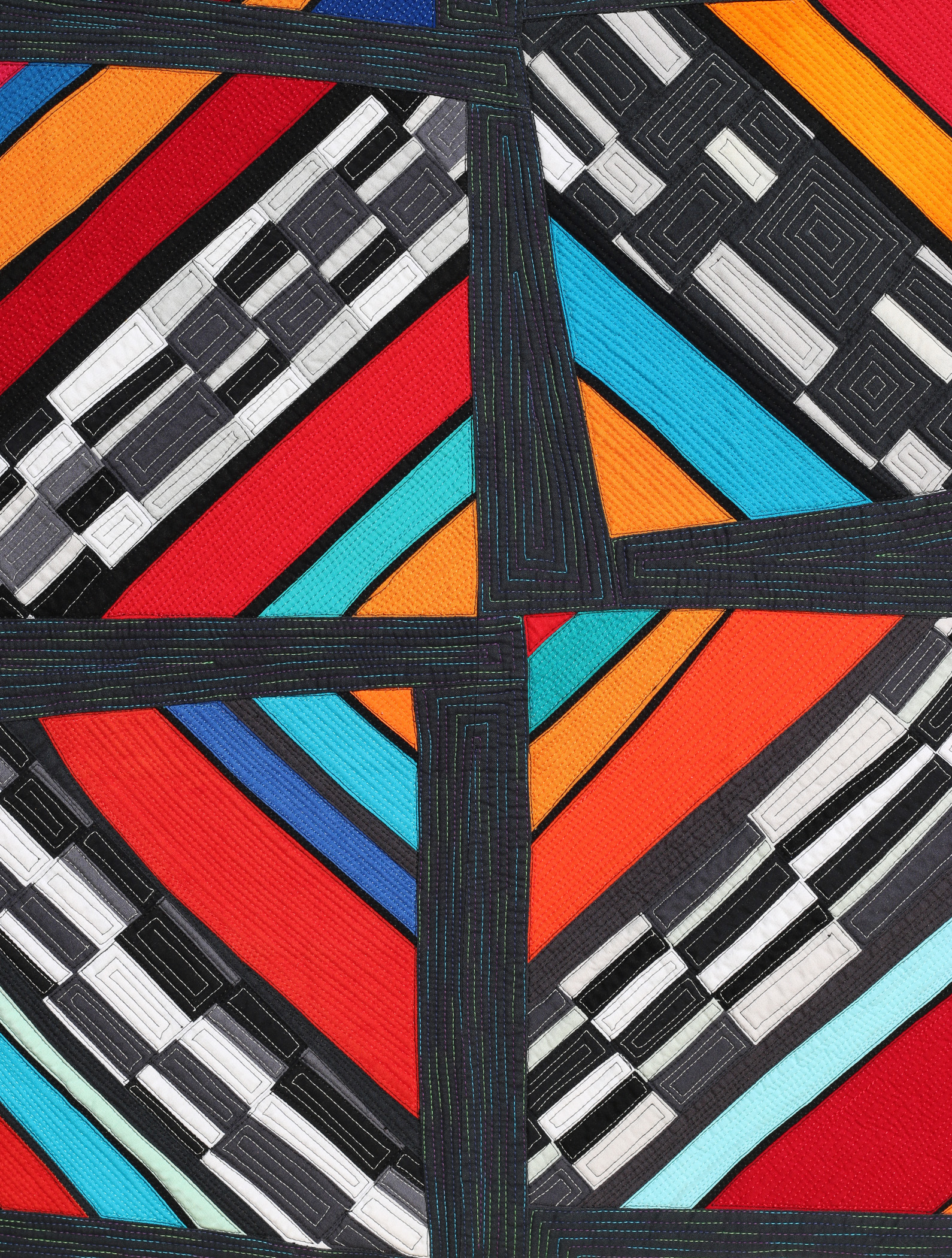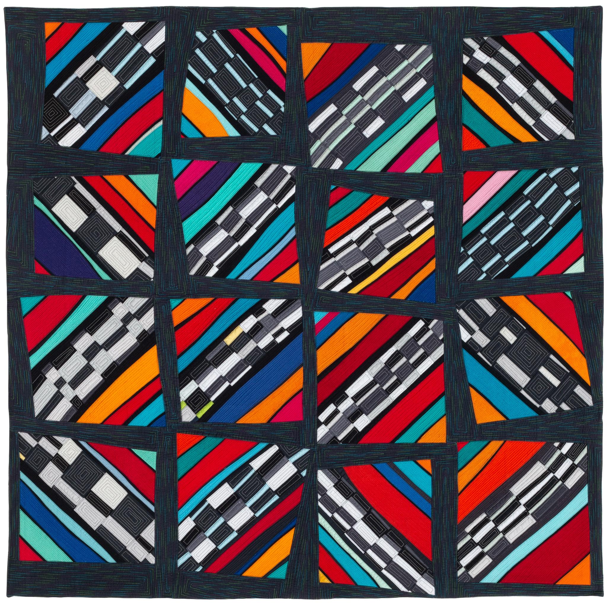 It often feels that we are on a collision course with disaster: climate disasters, political upheaval, over consumption. We run in circles, trapped on a dangerous track, unable to slow down or change course. “Collision Course” is a visual expression of this anxiety. Intense color, jagged diagonal lines, complex stitching, and the heavy grid combine to express the fear of being trapped in a speeding car, moving too fast, out of control, with no way out.