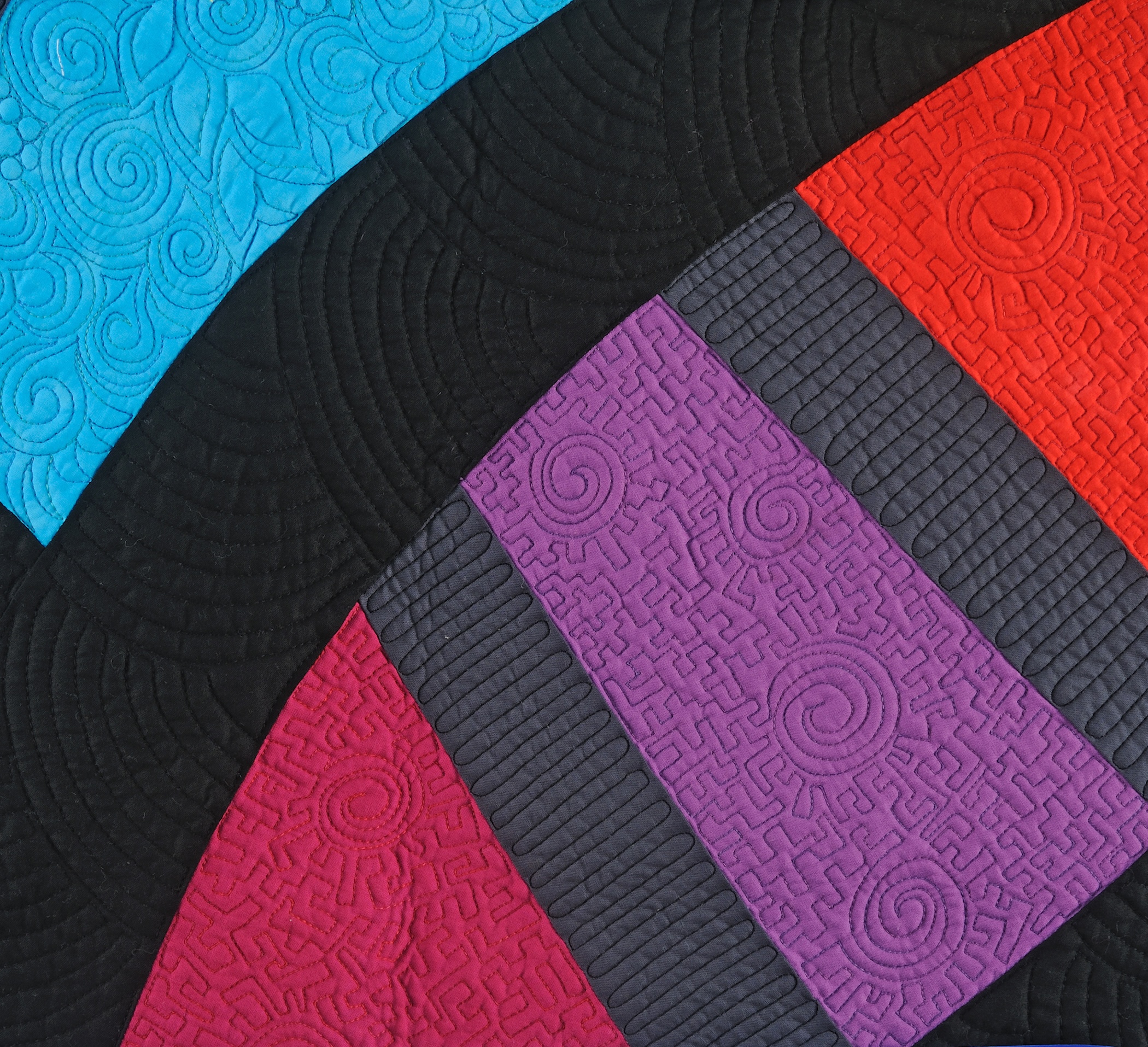 Aquarius celebrates curves cut freehand without a ruler. Creating lines and shapes directly out of fabric is a liberating dialogue with my materials. I started with the central pod shape, which might be an abstract fish or bird, with water or air rushing underneath it. Free motion quilting in a variety of motifs adds texture.