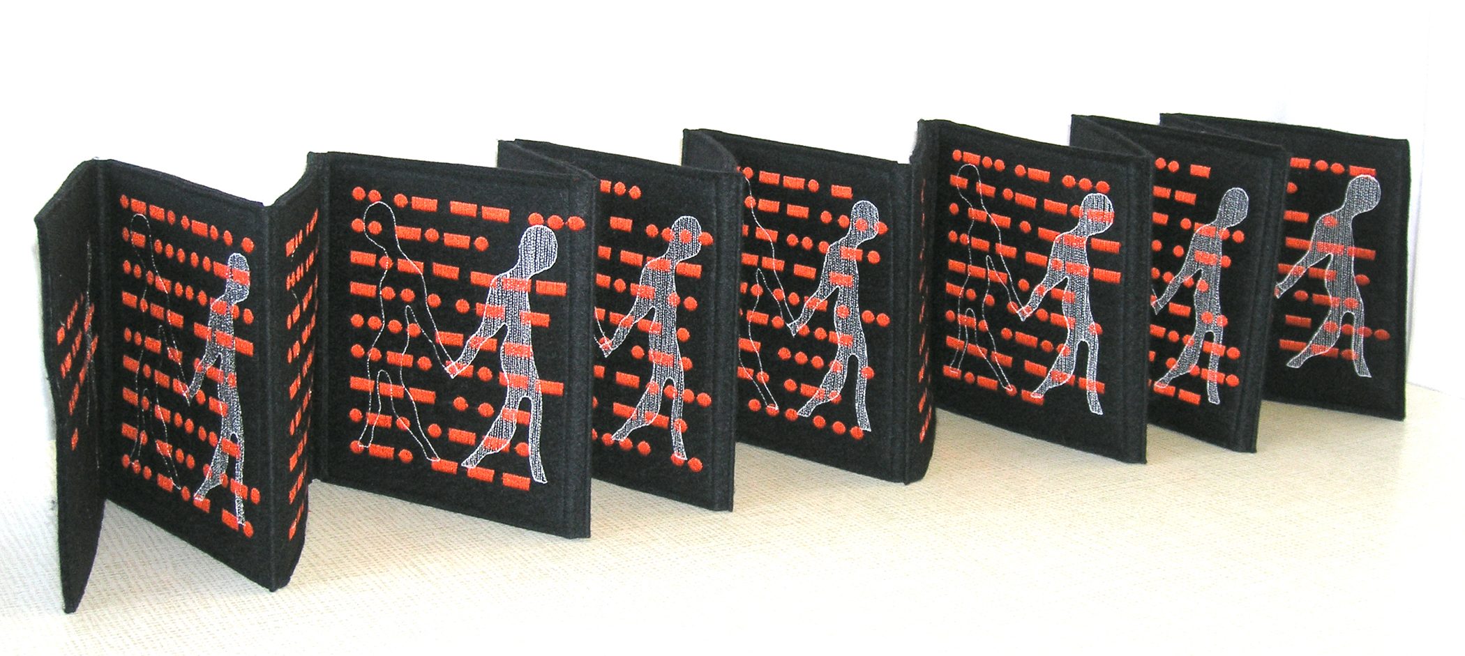 From the front one sees an argument written in satin stitched morse code and two figures going apart, if displayed open and viewed lengthwise one either sees outlined figures or a ghostlike figures.