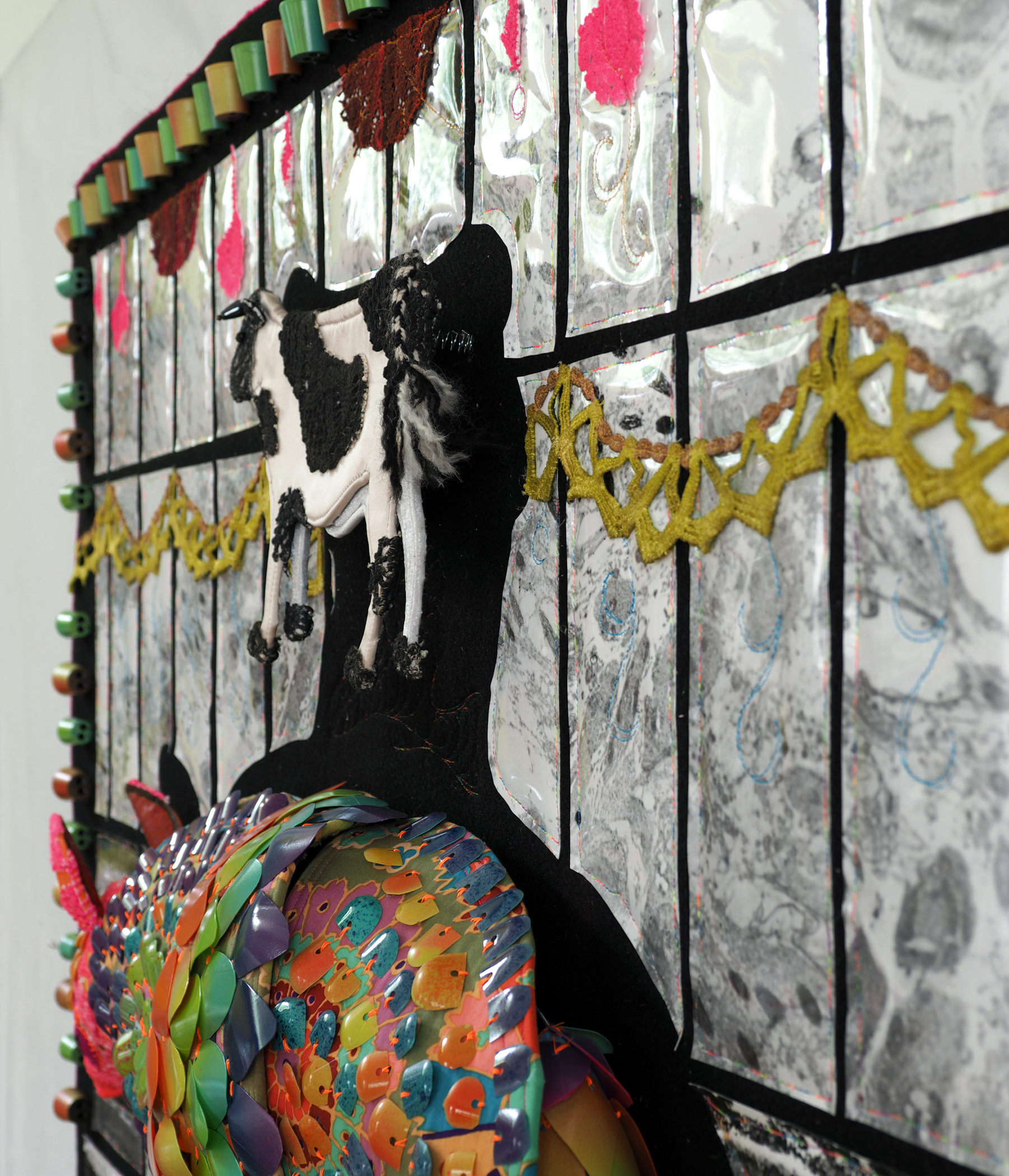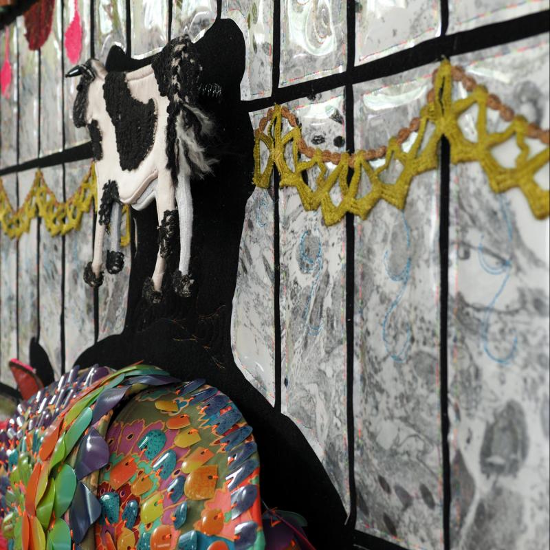 Recycled plastic jugs, vintage crochet doilies, light and electron microscopy photos, rubber stoppers, lace trims, paint, fabric, foam, felt