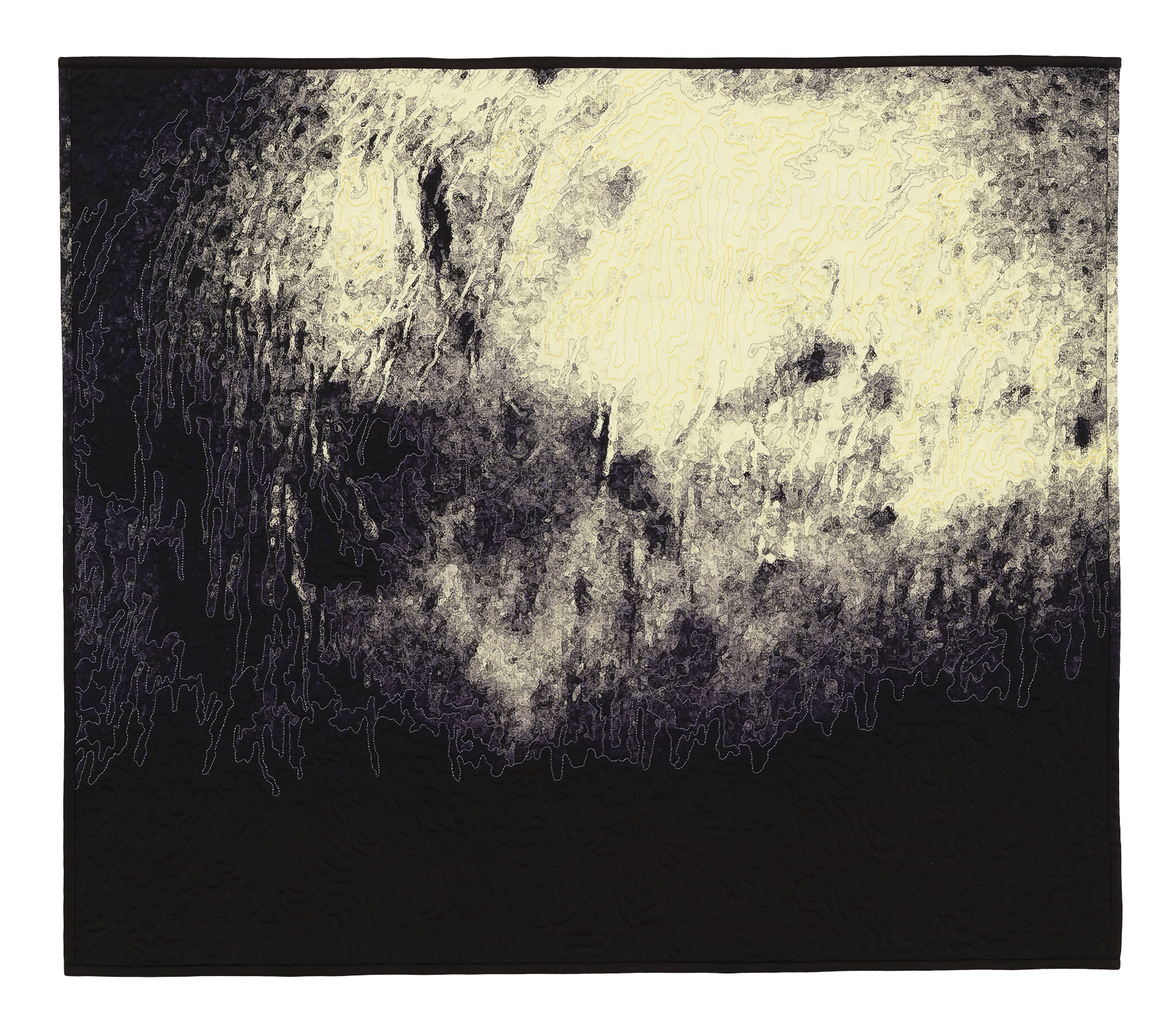Whole cloth, free motion quilted. Photo manipulated and enlarged digitally and inkjet dye printed. Back fabric is shibori discharged.