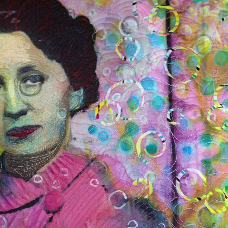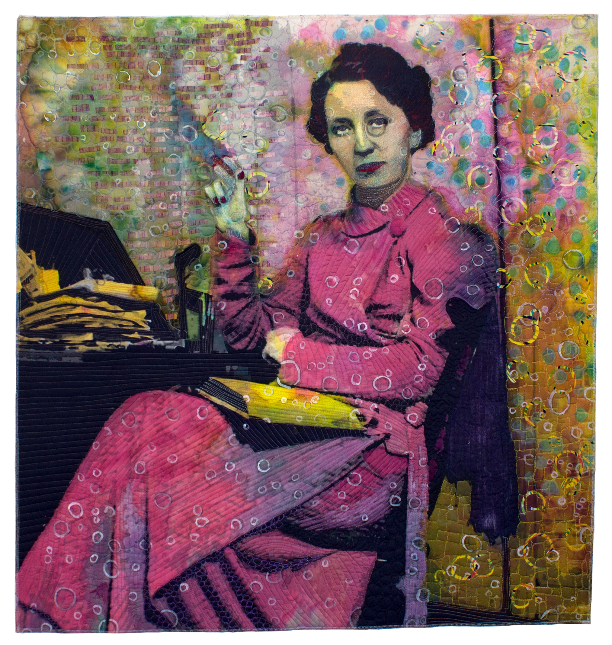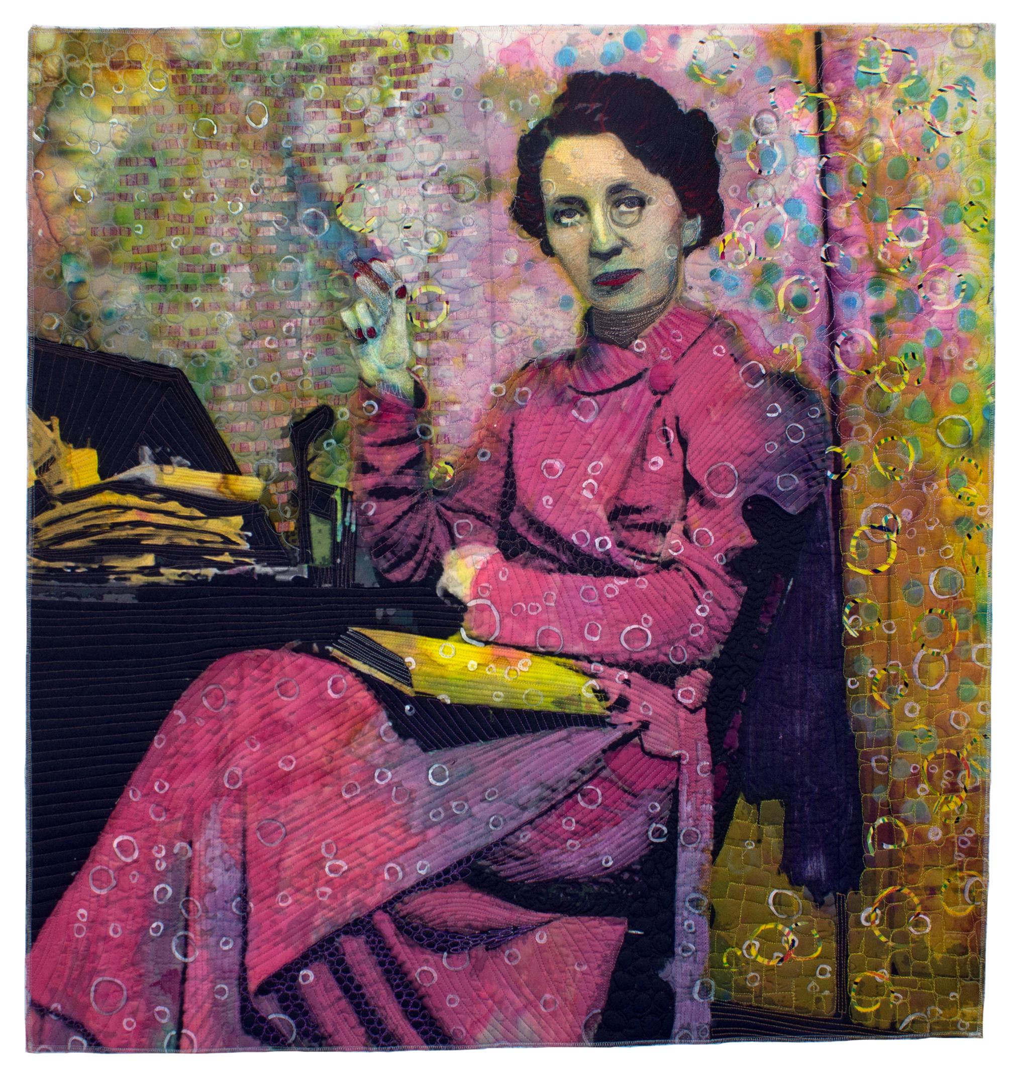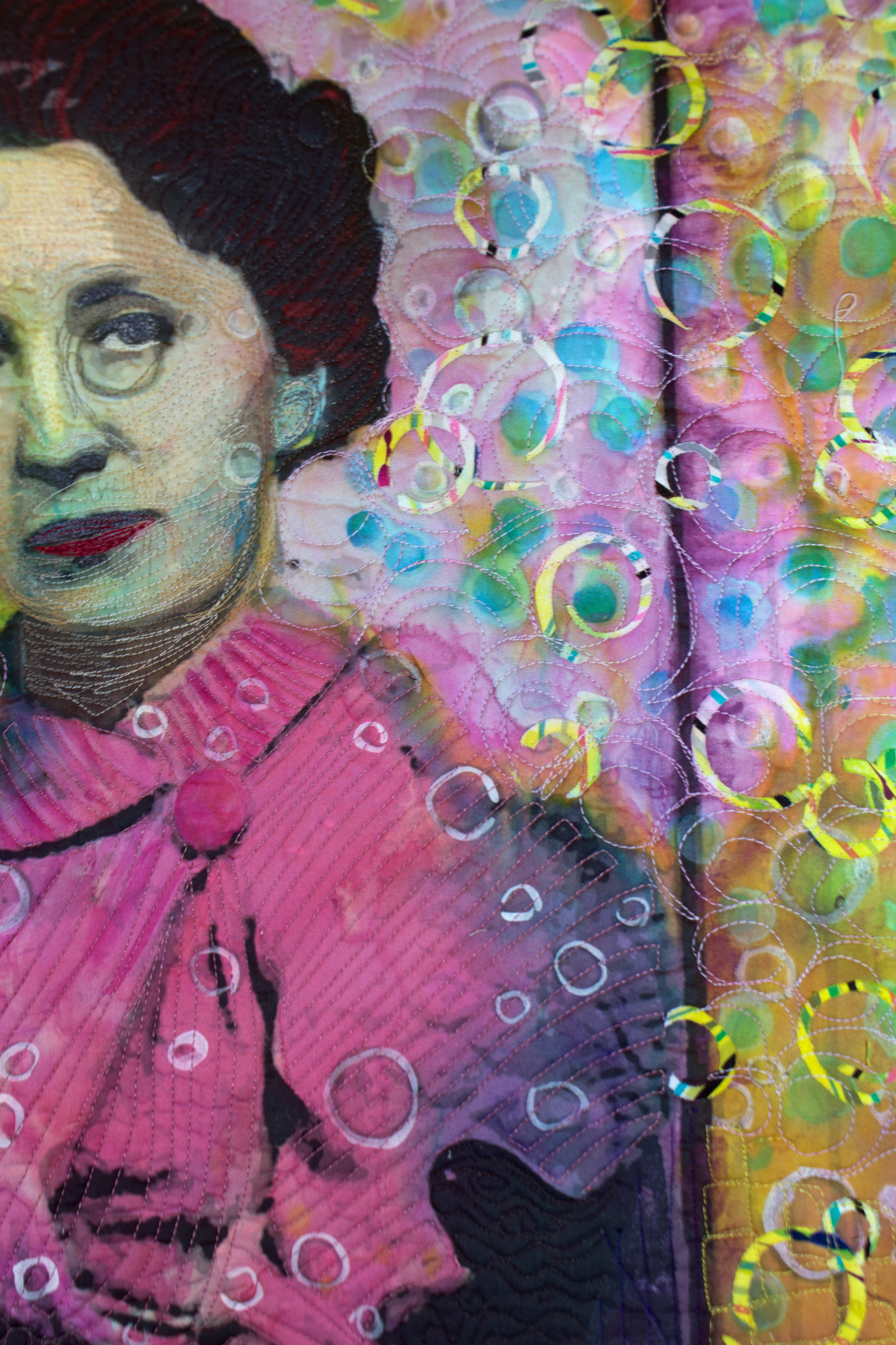 Whole cloth commercially printed from artists' images. Painted with acrylics, pigment sticks, liquid watercolor and other mediums. Fused fabrics. Quilted on stationary machine.