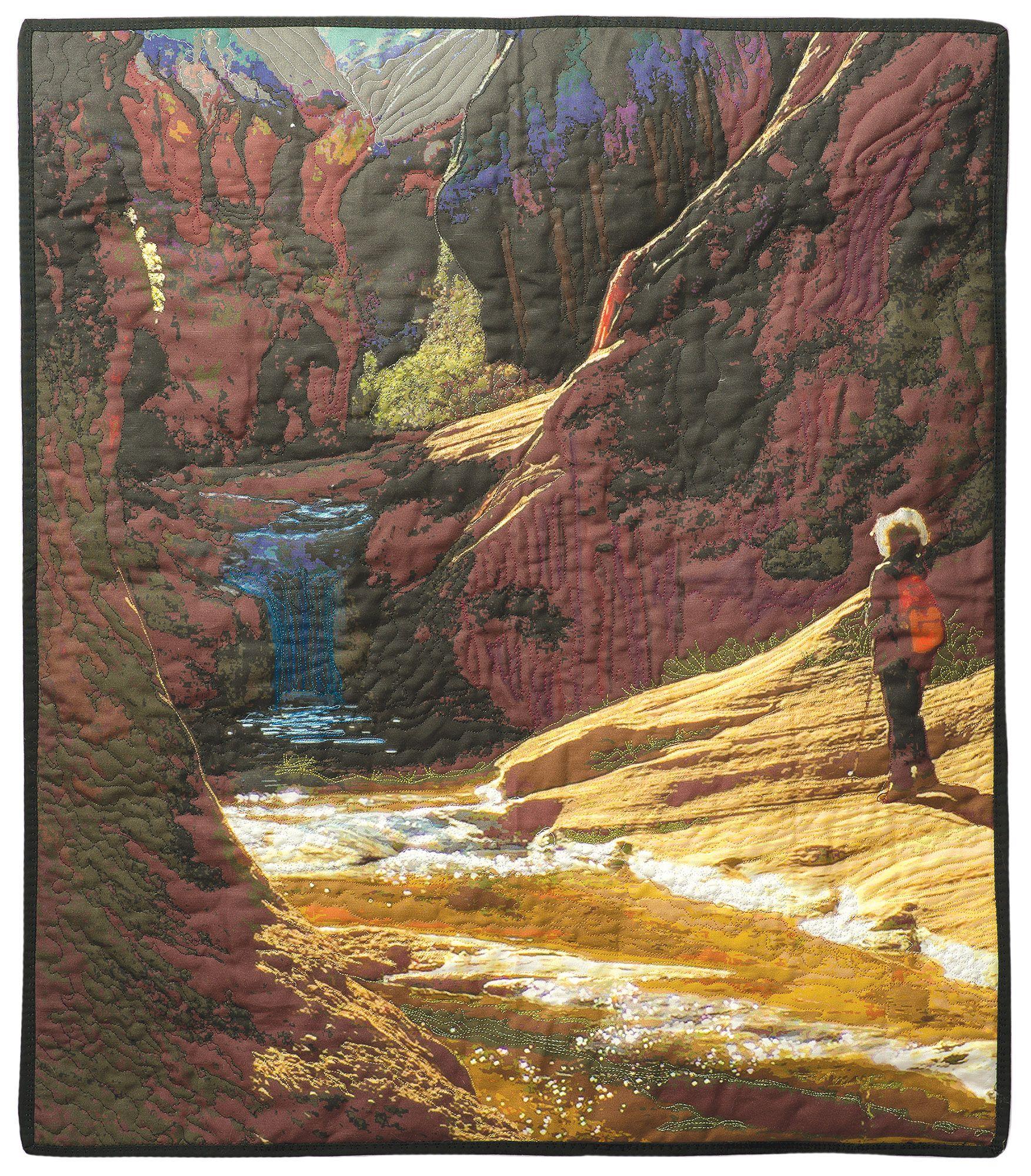 This quilt depicts a spot on the Anasazi Trail beside Quail Creek in the Red Cliffs Desert Reserve in Washington County, Utah. Shh! This area is not well known, and probably the best way to preserve it is to keep it that way. Don’t tell anyone about the ancient dwelling ruins or the dinosaur tracks. I call this quilt In Awe because that is the feeling it evokes.
