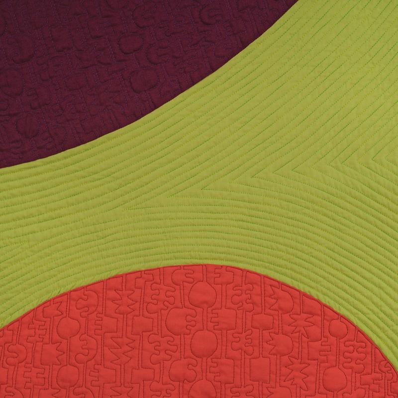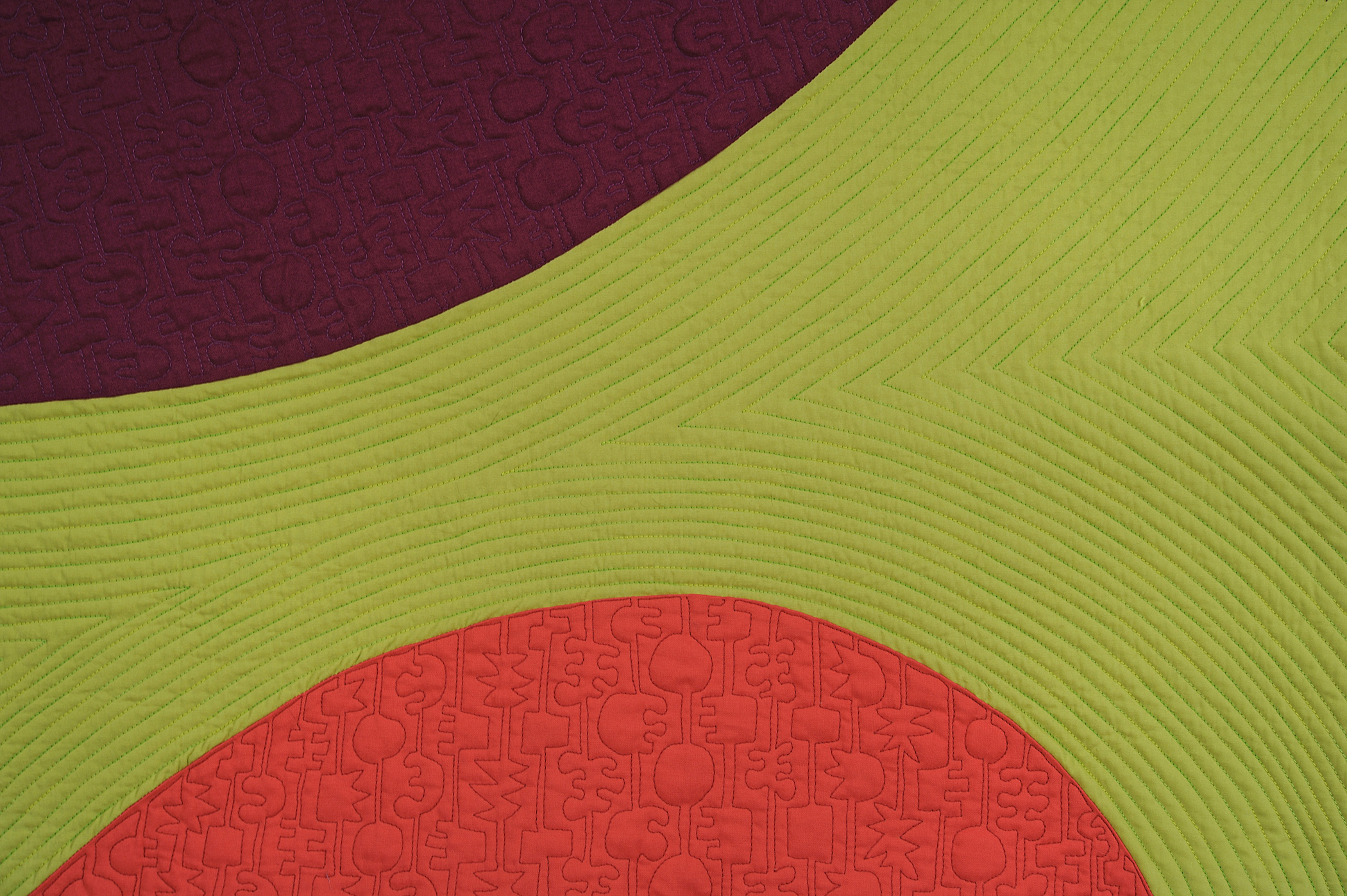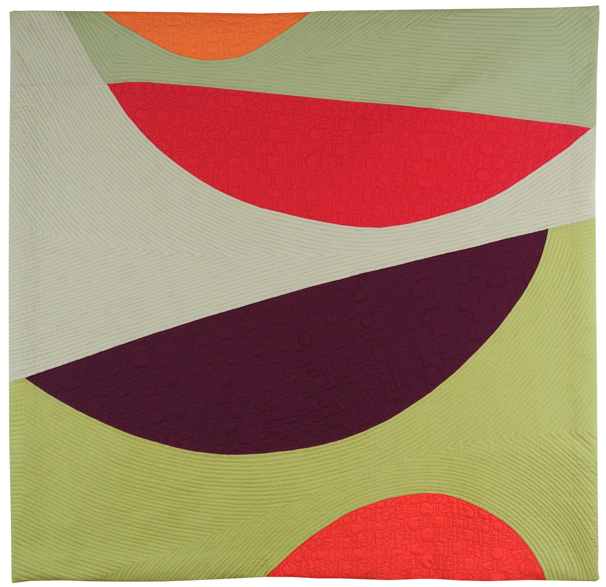 Balancing Art explores the relationships between large, curved shapes and open, negative space activated by dense free motion stitching. The shapes were cut freehand without patterns or templates using my rotary cutter as a drawing tool.