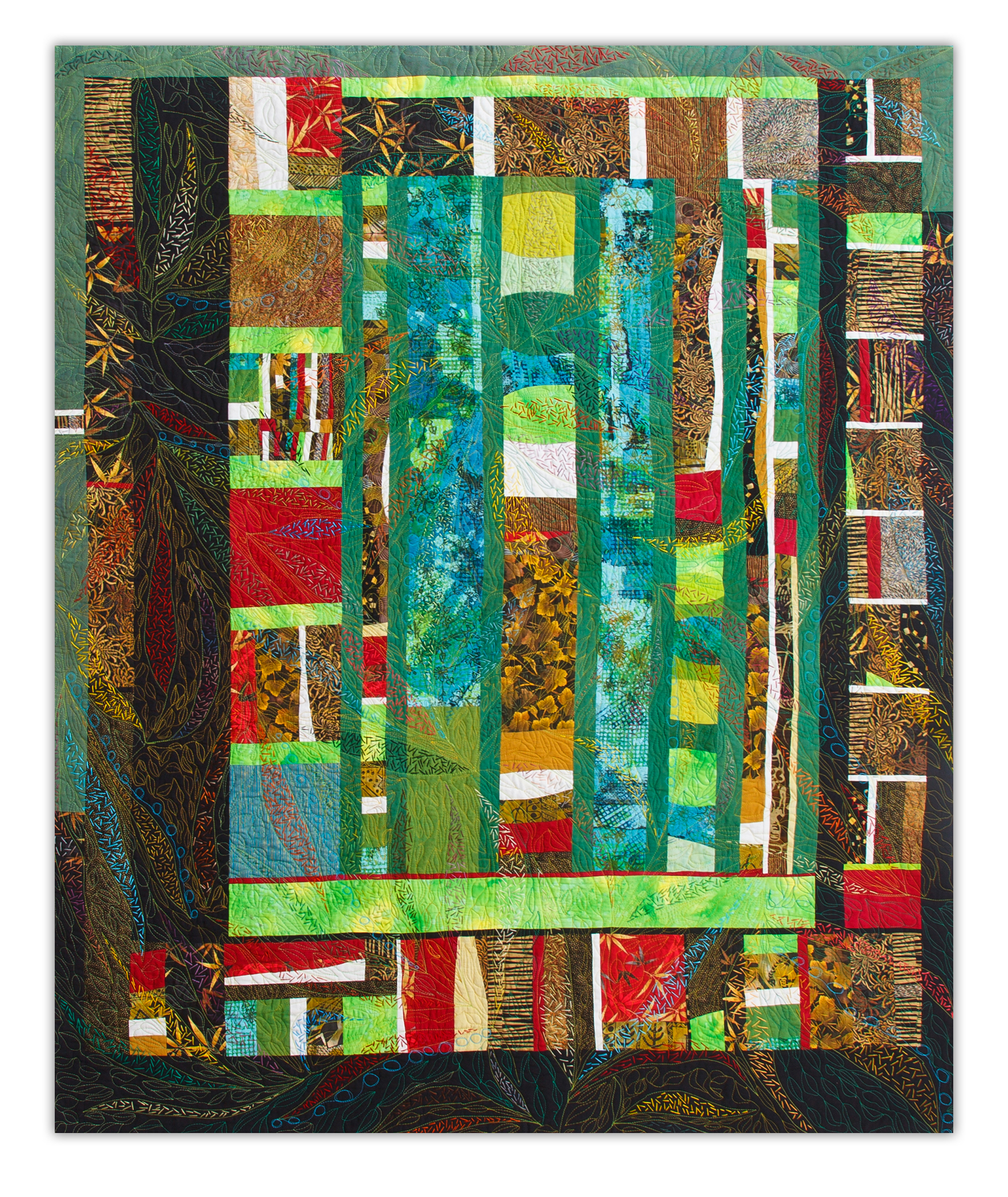 Cotton, both commercial and hand-dyed by the artist, cotton threads
