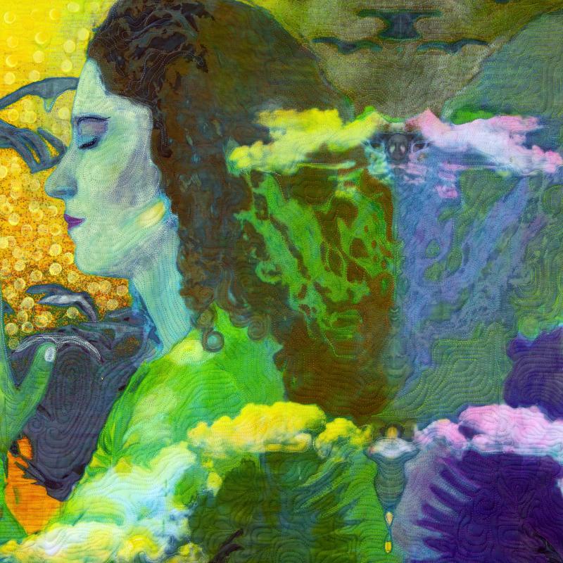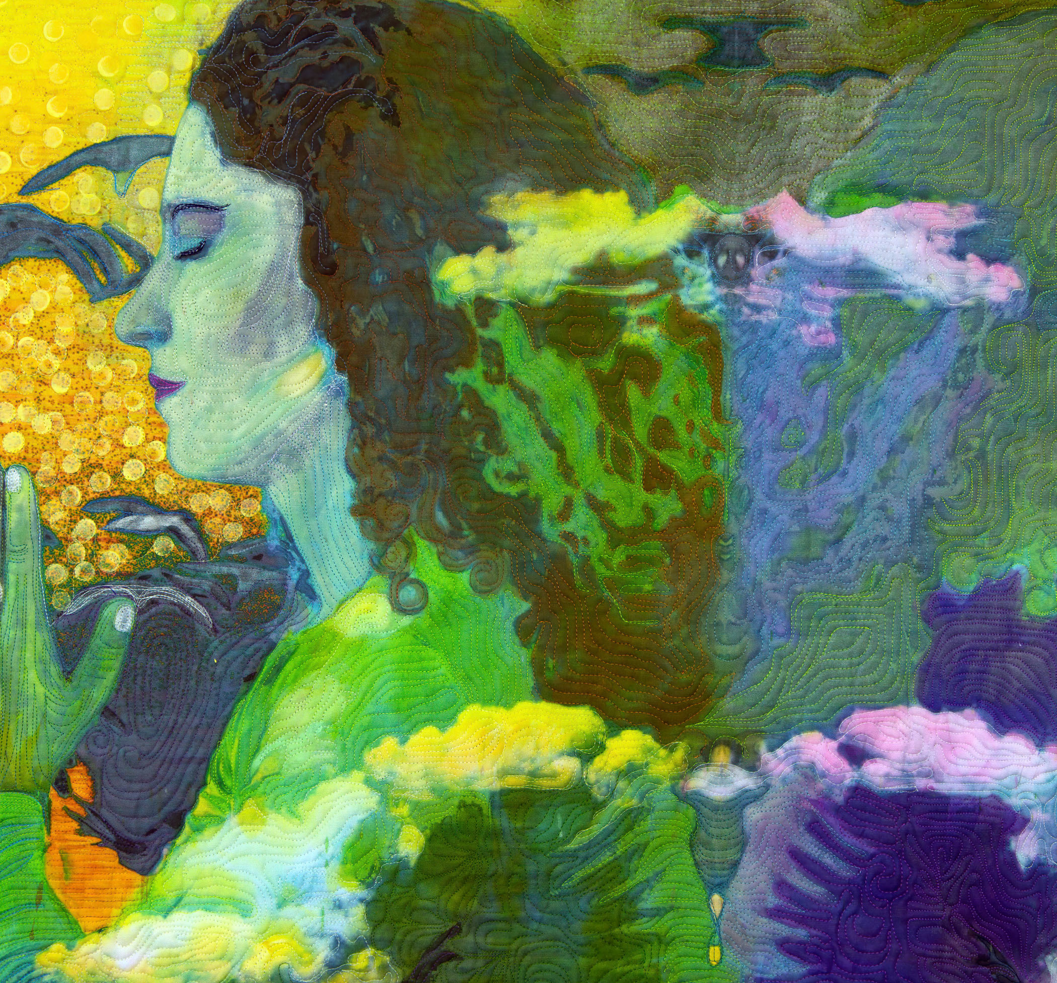 “Be Present” is a digital collage. The mirror image of two figures, one in full view and the other disappearing off the page; is a visual interpretation of the challenge of staying present in the moment. During meditation thought clouds drift through consciousness and problems pull at one's attempt to take time to experience the present moment. The digital image was printed commercially, painted and quilted without the use of computerized programs.