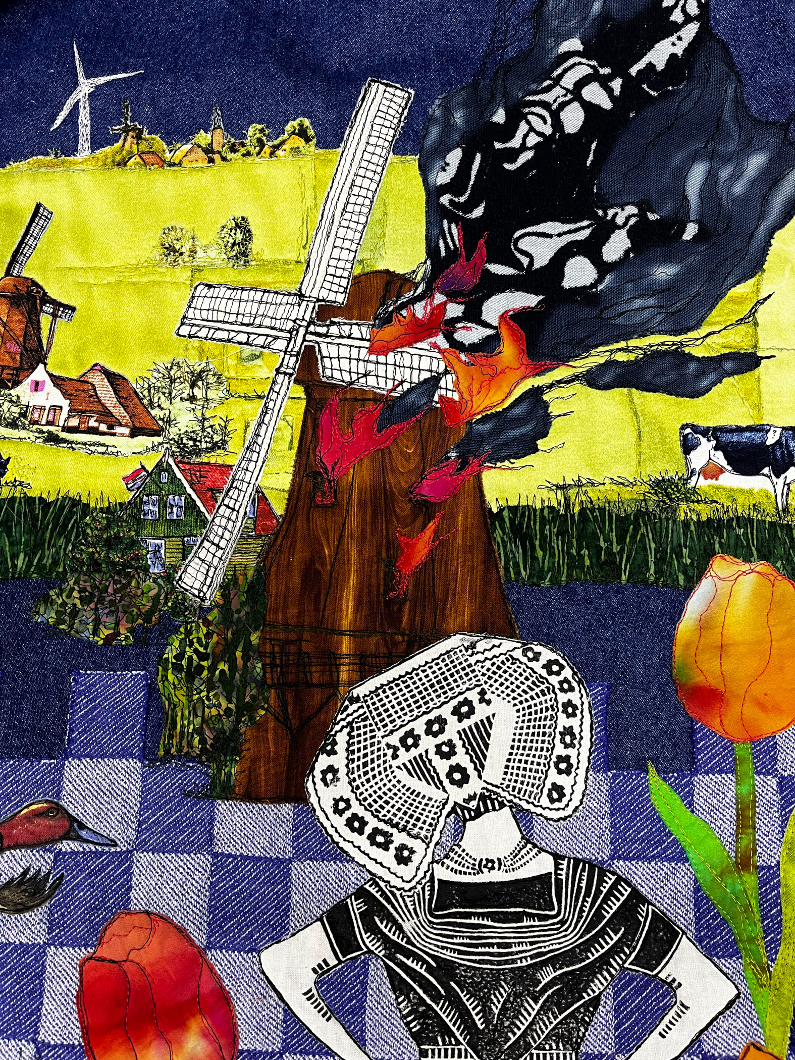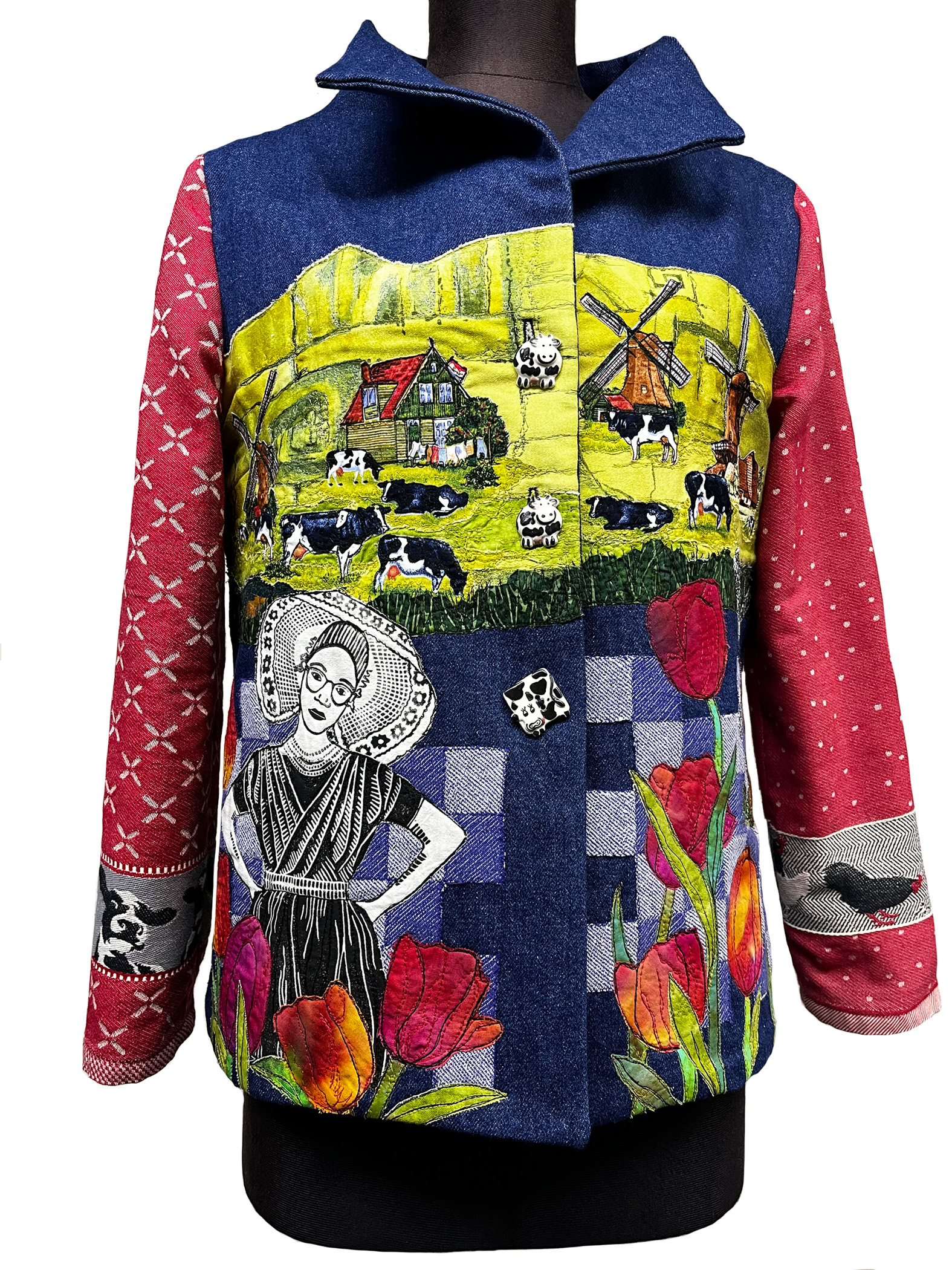Recycled denim, cotton, fabric paint, buttons