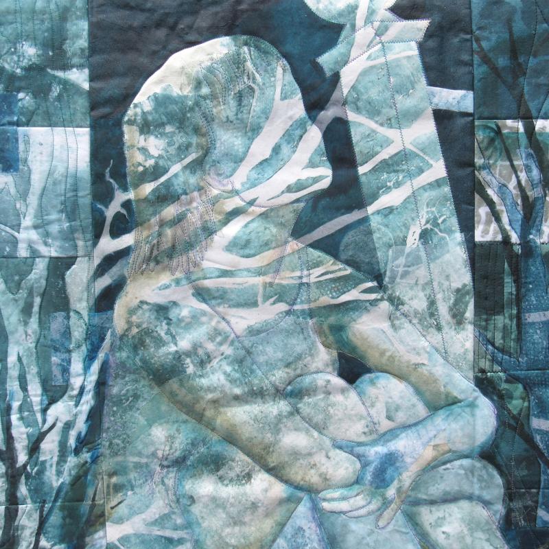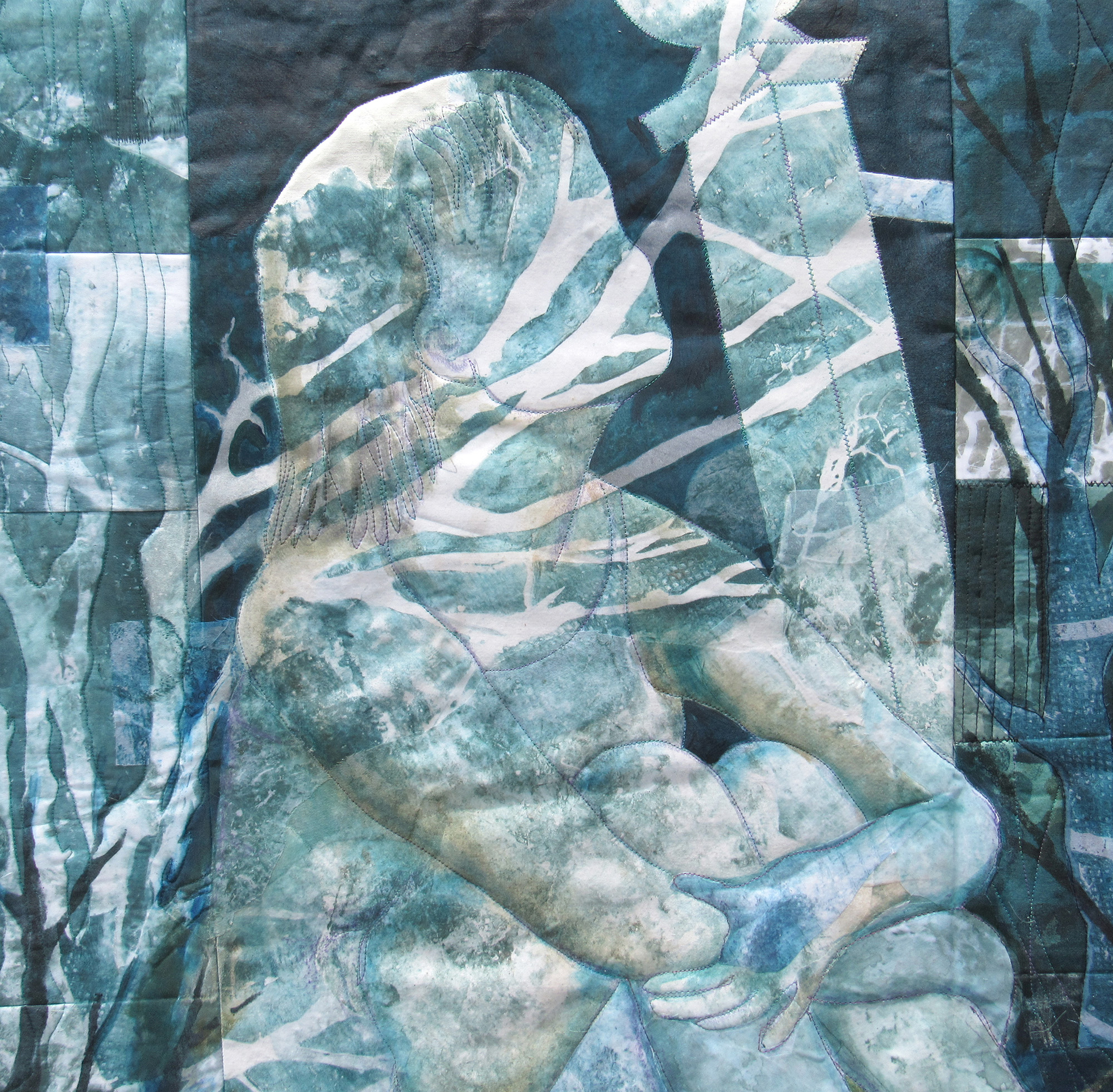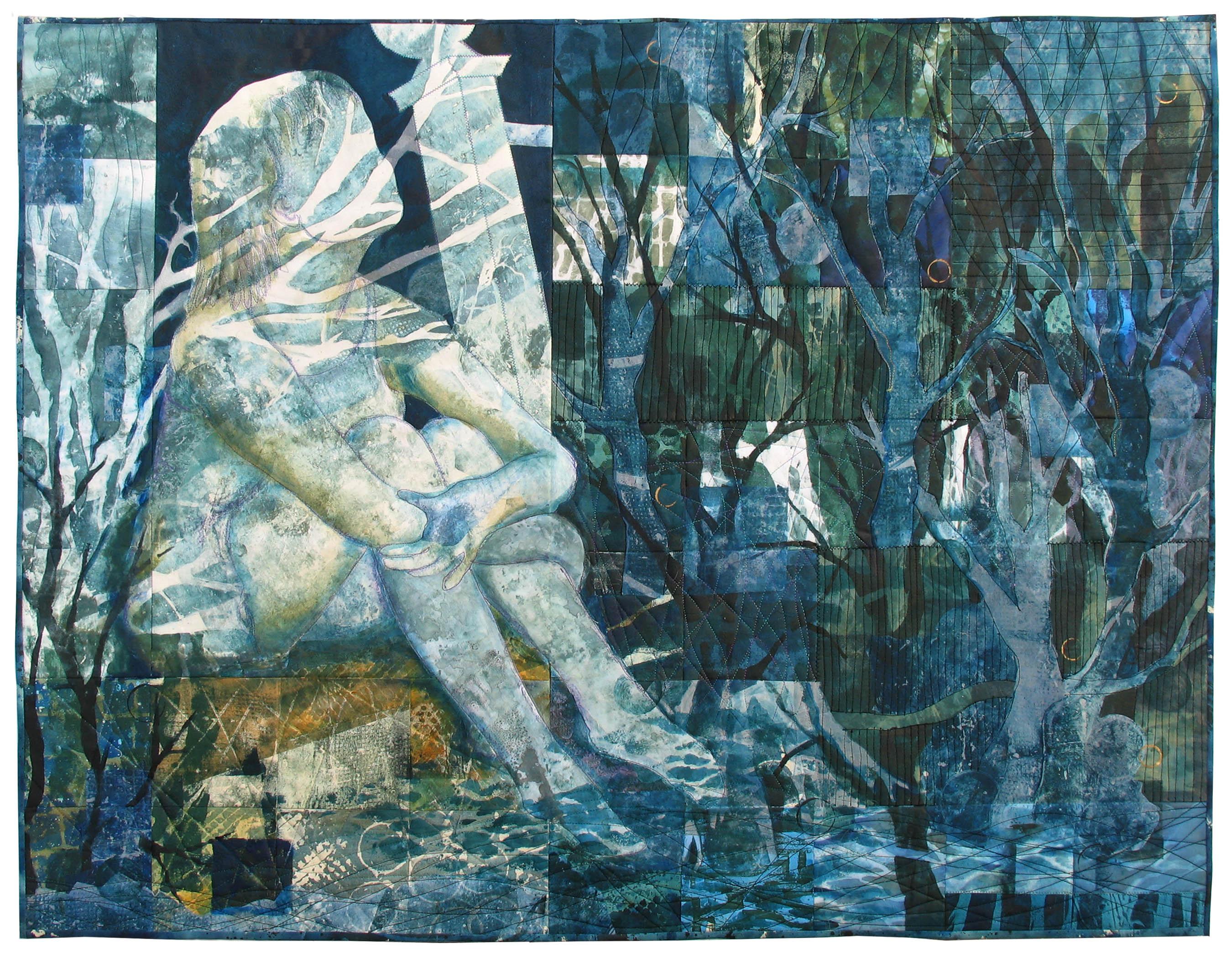 Monotype printed, stenciled, relief printed, painted, collaged, machine stitched