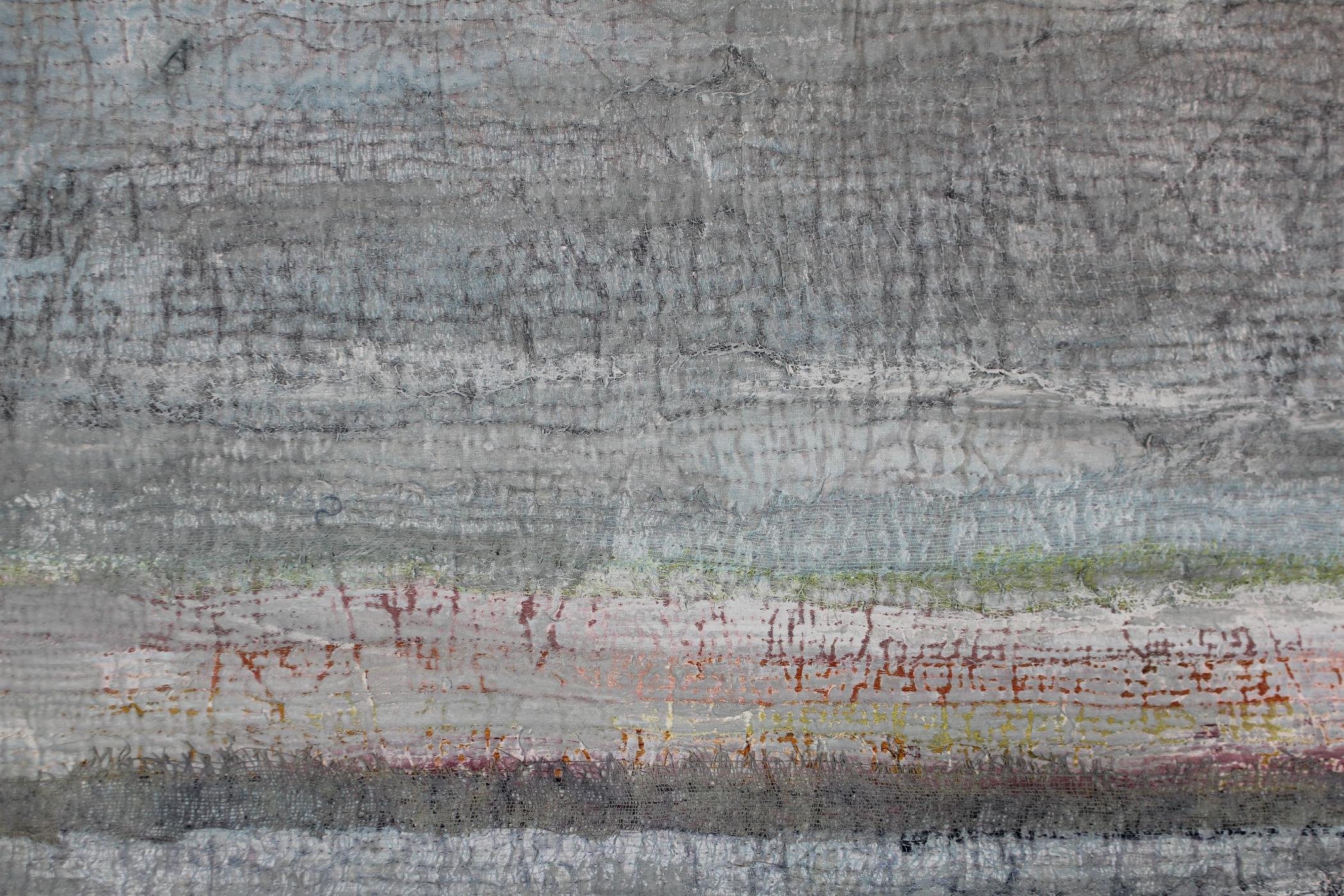 Dyed and painted fabrics and cheesecloth layered over an old bed quilt, free motion stitching, layers of acrylic paint