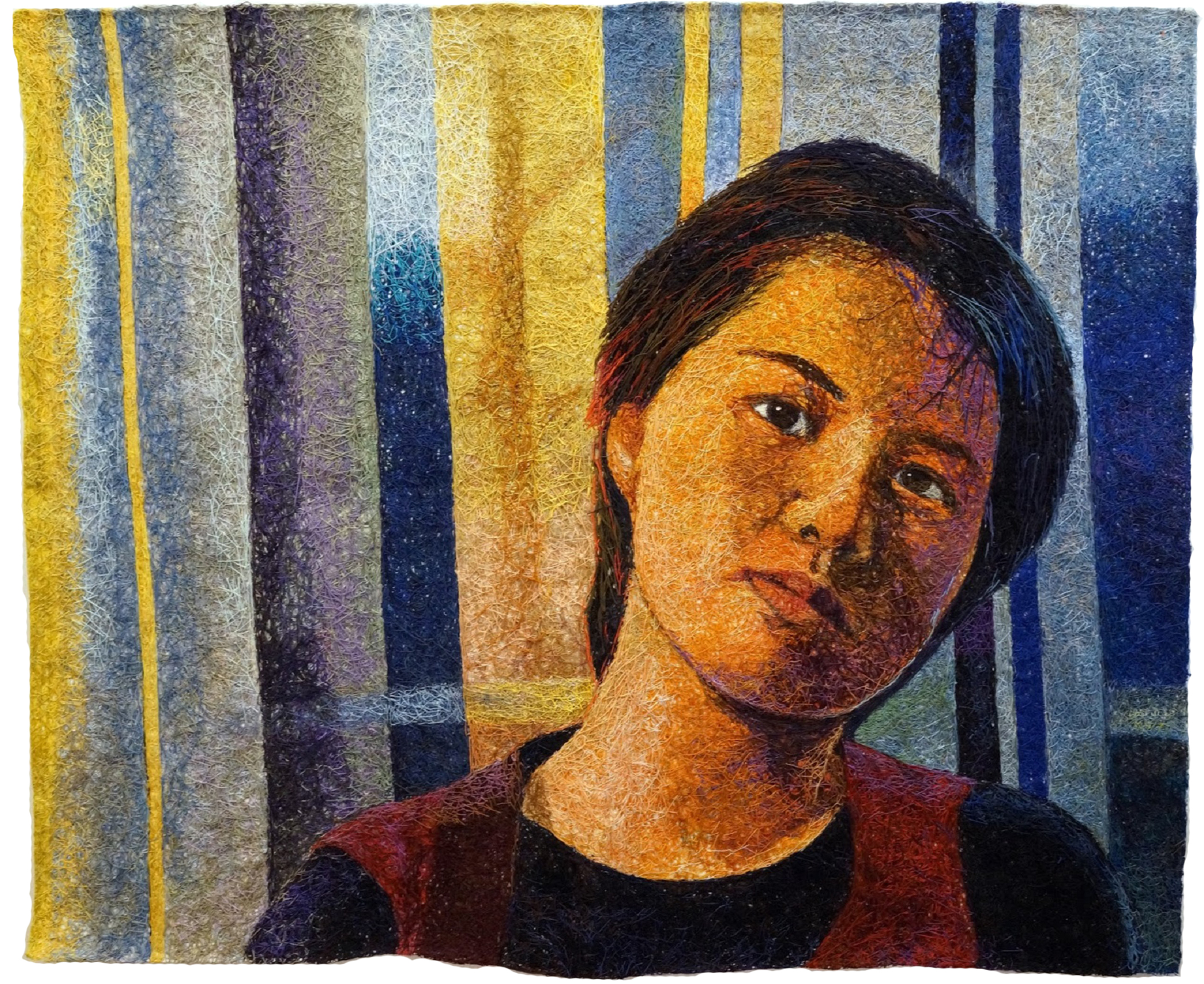This work portraits a second generation Asian American female who embarks on an inner journey of self-discovery and self-acceptance. To reflect the concerns and complications of living "in-between" rather than simply belonging, uncertainties inscribed in the lives of strangers from a different shore, and celebratory hybridity in a culture of heterogeneity, I deliberately use the seemingly conflicting elements in my work such as complementary colors and natural and rigid lines.