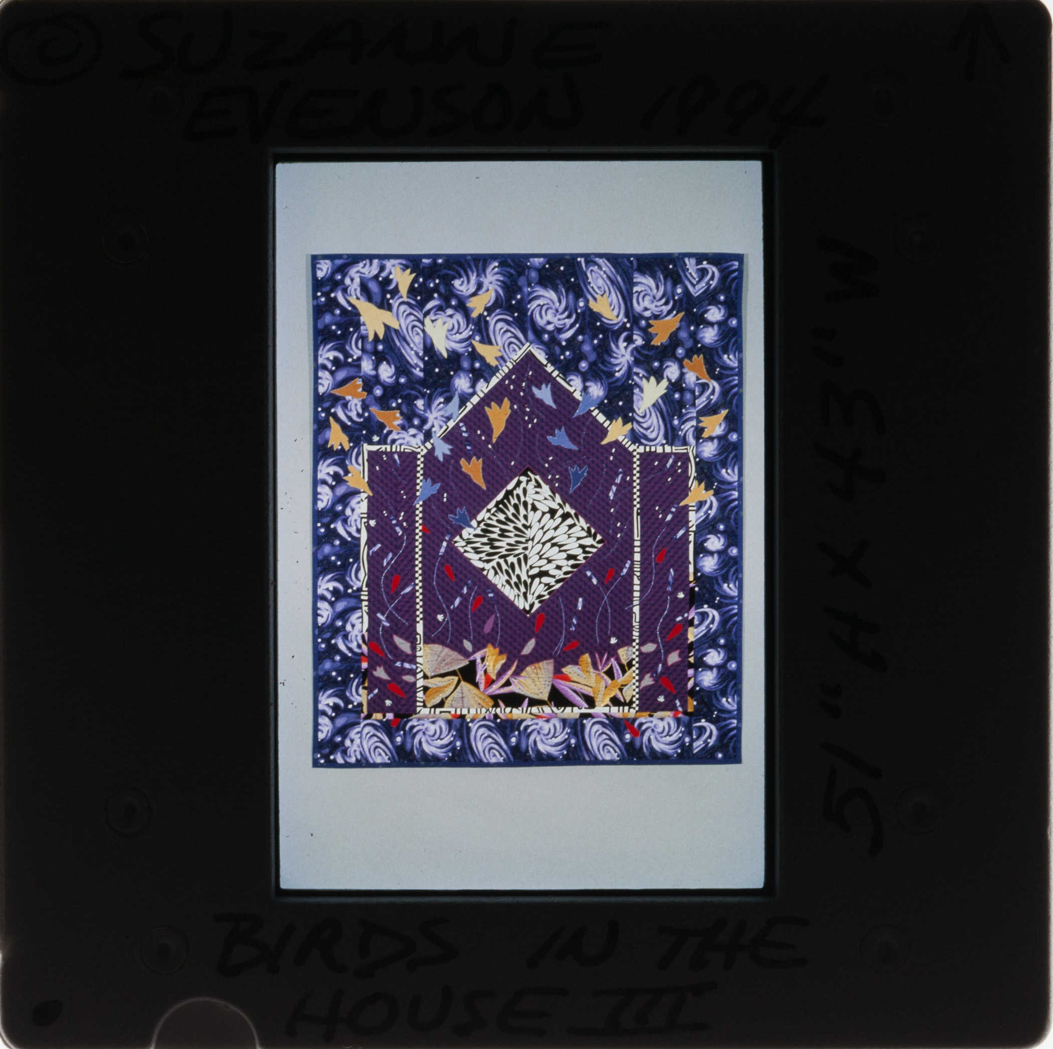 The "Birds In The House Series" was inspired by an old wives' tale told to me by my mother: a bird in the house is a warning sign. She recounted that as a child, just before a fire at her farm, a bird was in their house. Years later, when confronted with a difficult personal situation I noticed a bird pecking daily on the window of my studio. I perceived it as a warning that my center -- my creative soul -- was in danger. This quilt, the third in the series, evolved after I had a successfully survived a serious health issue. Once again, a bird had offered a warning. For me, birds are protective spiritual entities and often appear in my art.