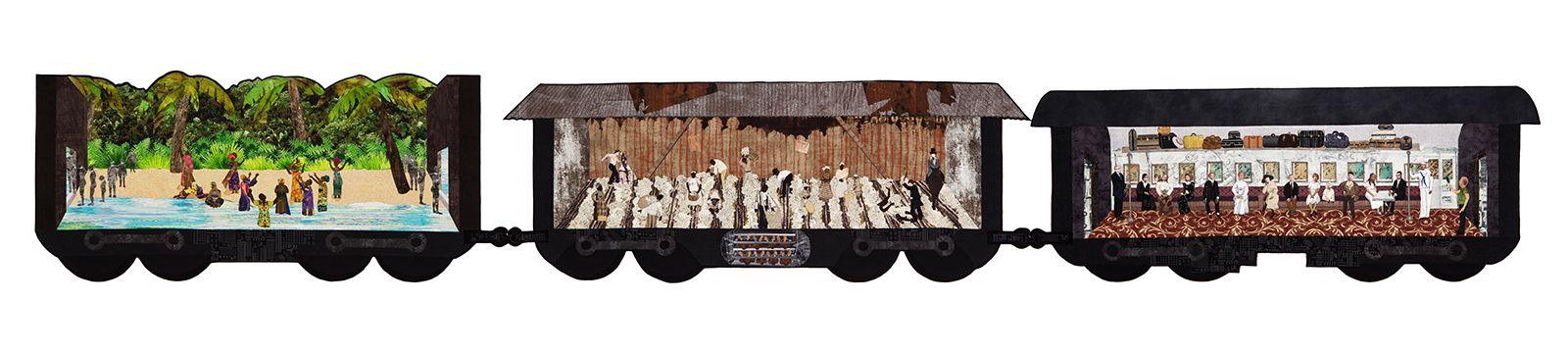 Through the metaphor of a train (a vehicle that moves inexorably through time, picking up people in one place and depositing them in another), this triptych tells the story of the passage of my ancestors from freedom to slavery and into the present: a journey that inevitably ends in me, an observer of my own past, recording the scene on my cell phone. By using the faces of my actual relatives (great grandparents, aunts, uncles, parents, etc.) in the lead car, I recreate my family as passengers in our second Great Migration out of the Jim Crow South in search of the illusive promise of America.