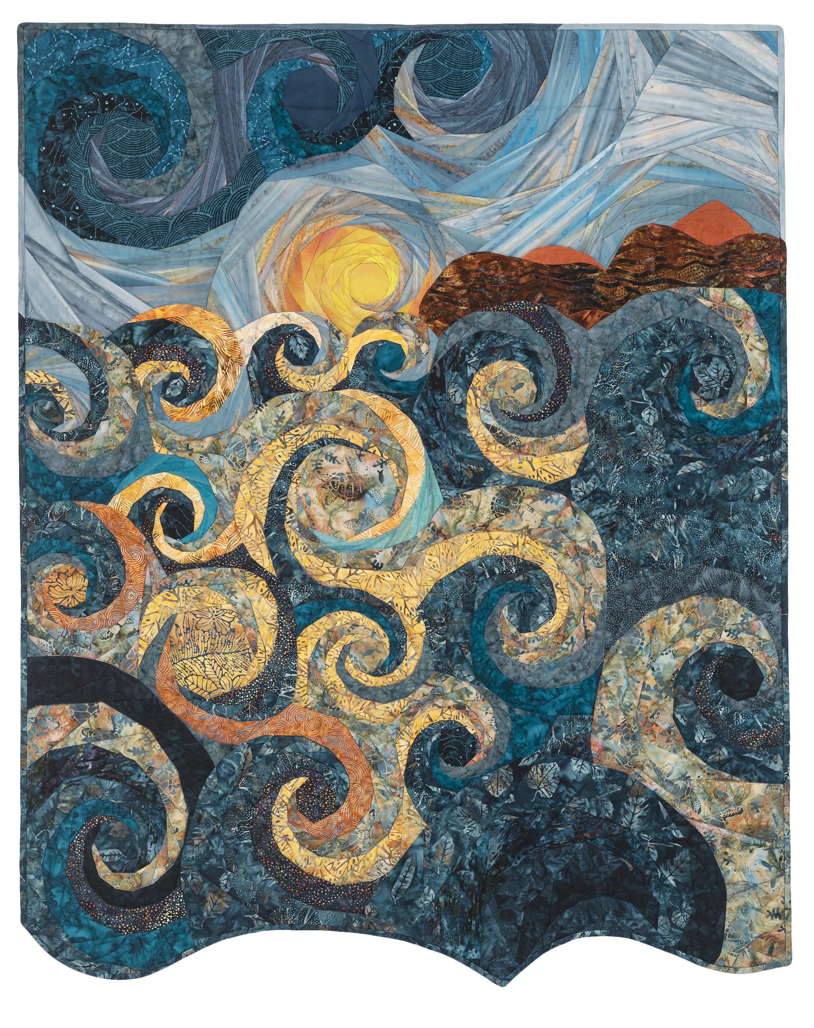Blue Attitude resembles my piece, L'Attitude Bleue, which was included in the H2Oh! exhibition. My efforts to recreate a smaller sized but similar quilt as a commission proved challenging but wonderfully rewarding. I based the design on thoughts used to create the original piece: a photo of sun on the water in Tahiti, the color of indigo blue and a jazz rendition of 'All Blues' by Miles Davis.