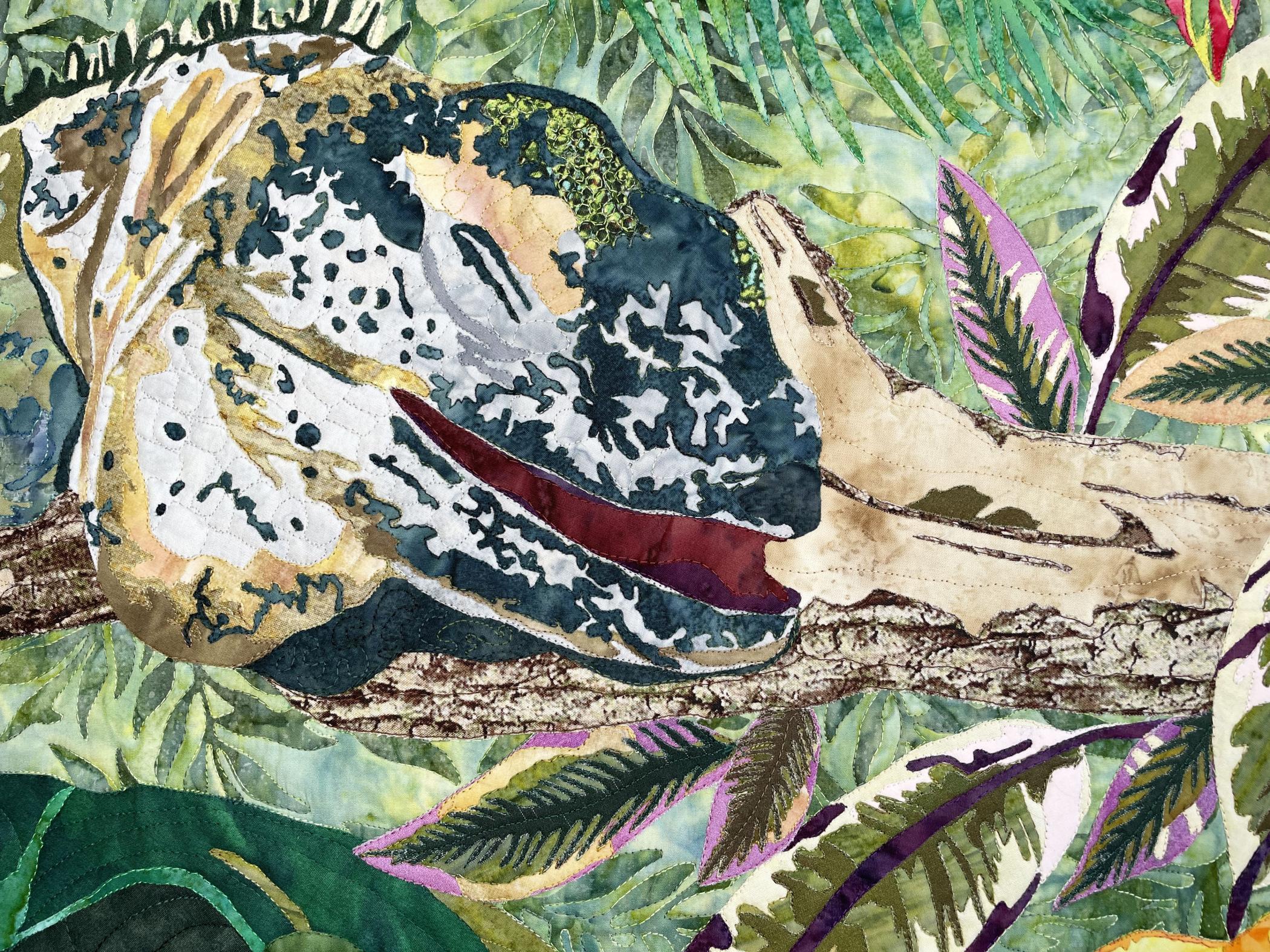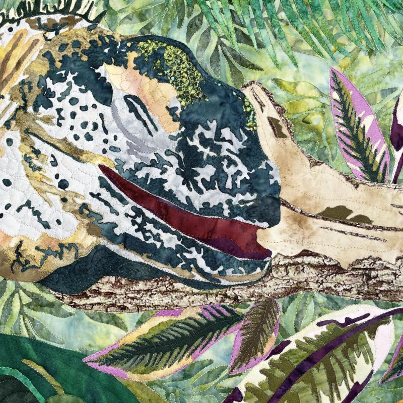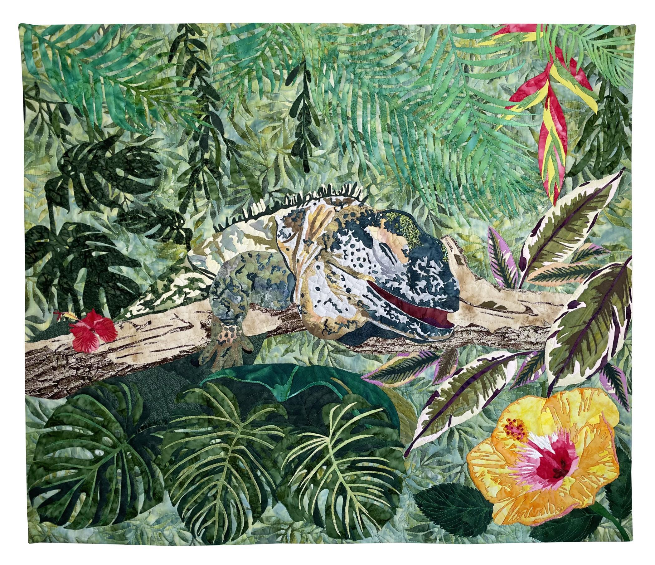 My artwork portrays nature's delicate equilibrium, featuring a Blue Cayman Iguana seamlessly blending into its verdant jungle habitat. Using vivid textiles and raw edge appliqué, I illustrate the iguana poised to indulge in a resplendent hibiscus bloom. Frozen in fabric, the iguana’s stealthy guise and the flower’s vibrant bloom demonstrate the intricate interplay of existence.