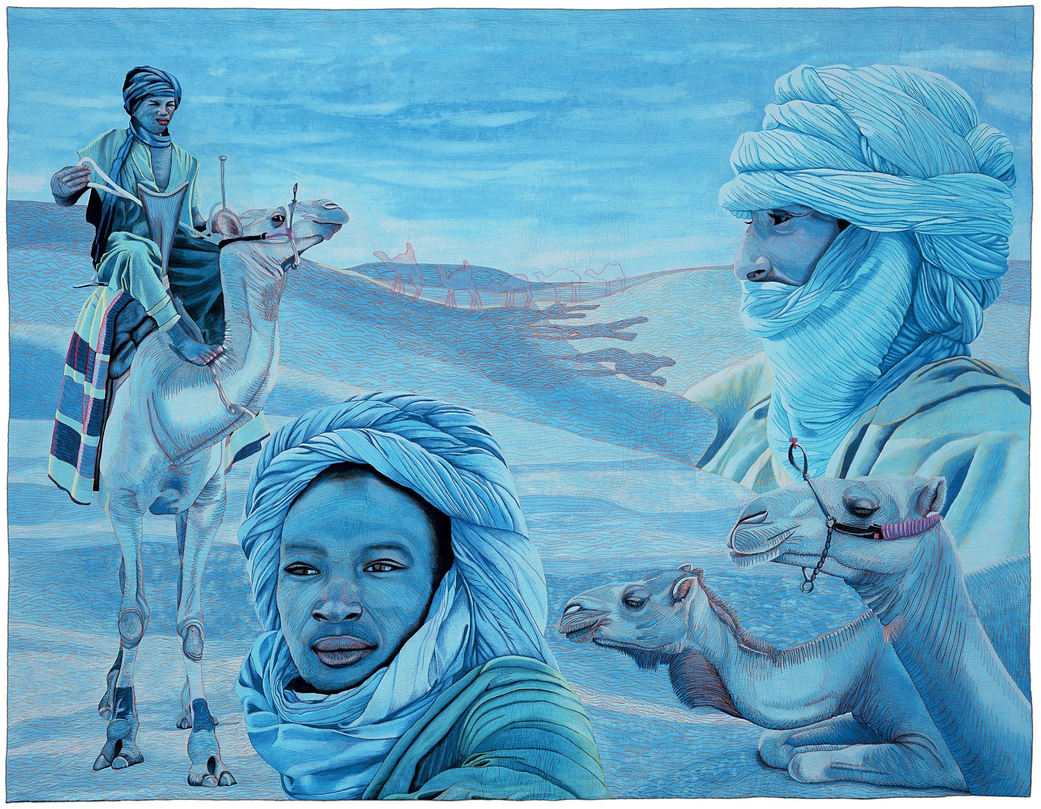Blue Men is the nickname given to the nomadic Tuaregs who roam the Sahara desert on their camels. They wear indigo blue turbans which gives their skin a blue tint. This quilt is a tribute to the many Tuareg men I befriended while living in Africa. This is a whole cloth quilt, painted only with blue dye. The many colors of thread in the quilting give it a touch of reality.