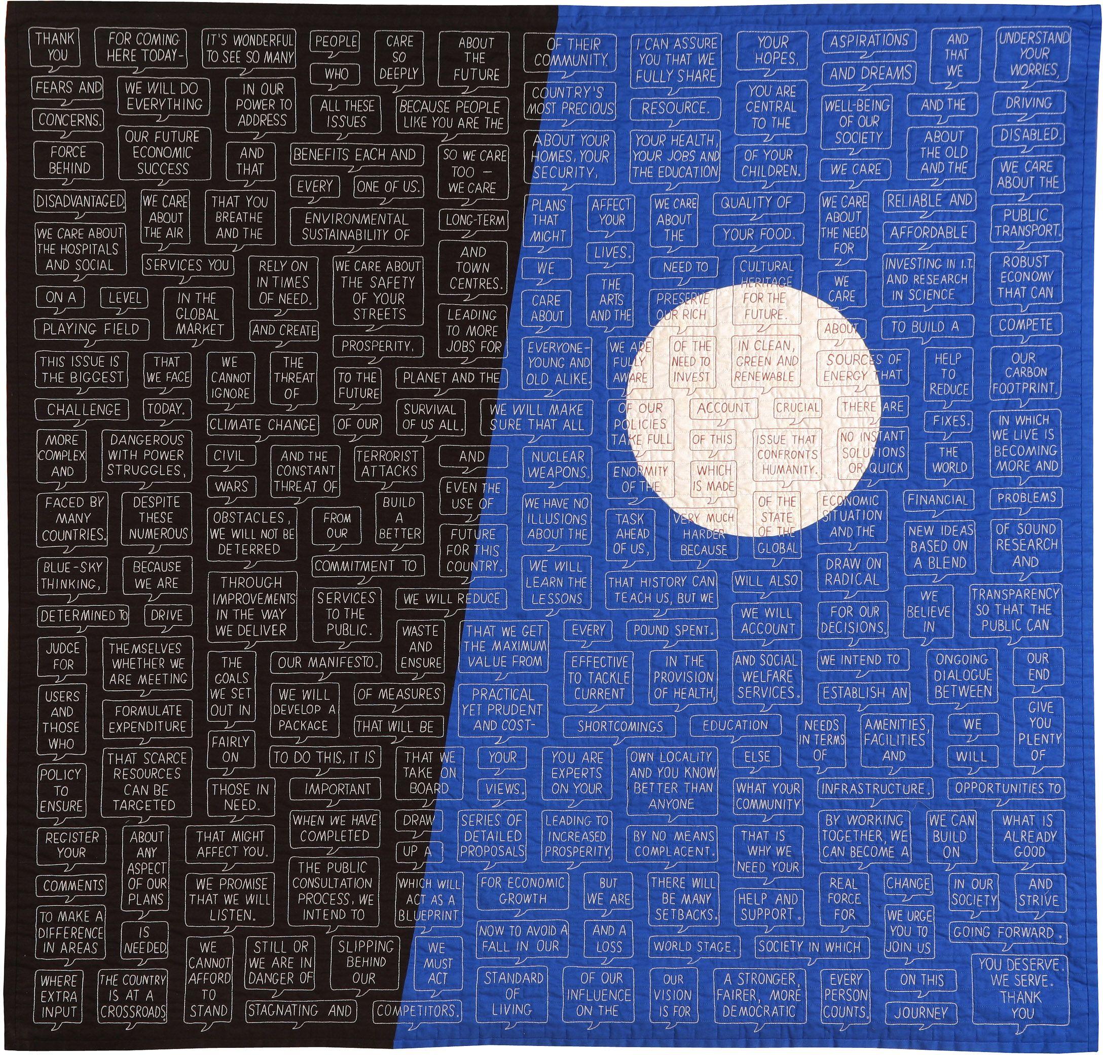 This quilt is an exercise in empty political rhetoric. The text purports to be a rallying speech by a political candidate who could belong to any political party, since the promises and policies are so commonplace and vague. I wrote the text as I stitched it to fit into the speech bubbles. It is decipherable in its entirety with effort, but I hope that individual phrases - often jargon and clichés - stand out, giving a flavor of the whole.