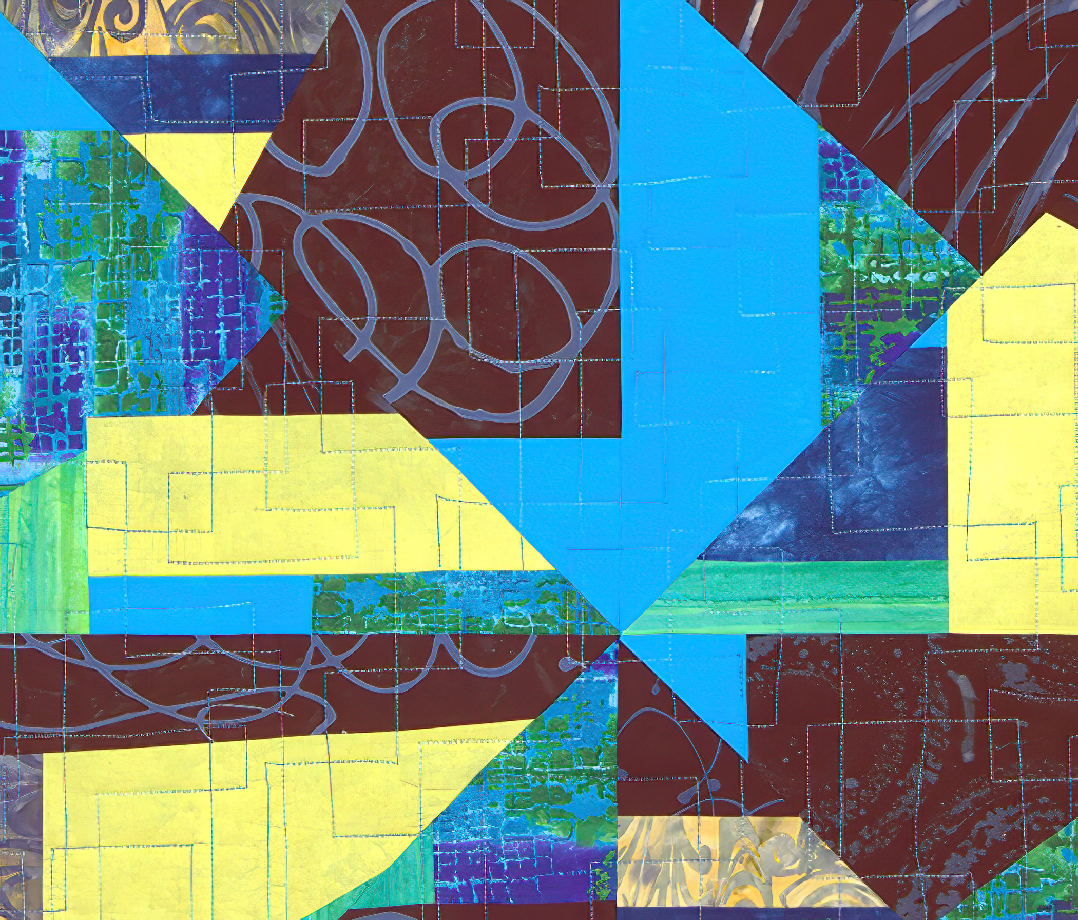 My interest in geometric shapes was an intense force behind the development of this quilt. Intertwined and related squares were chosen for the overall pattern. Choices of color and placement of component parts required painstaking design decisions and many sequences that were tried and modified. The result is a quilt that is both regulated and controlled, yet pleasing to the eye and faithful to a sense of order.