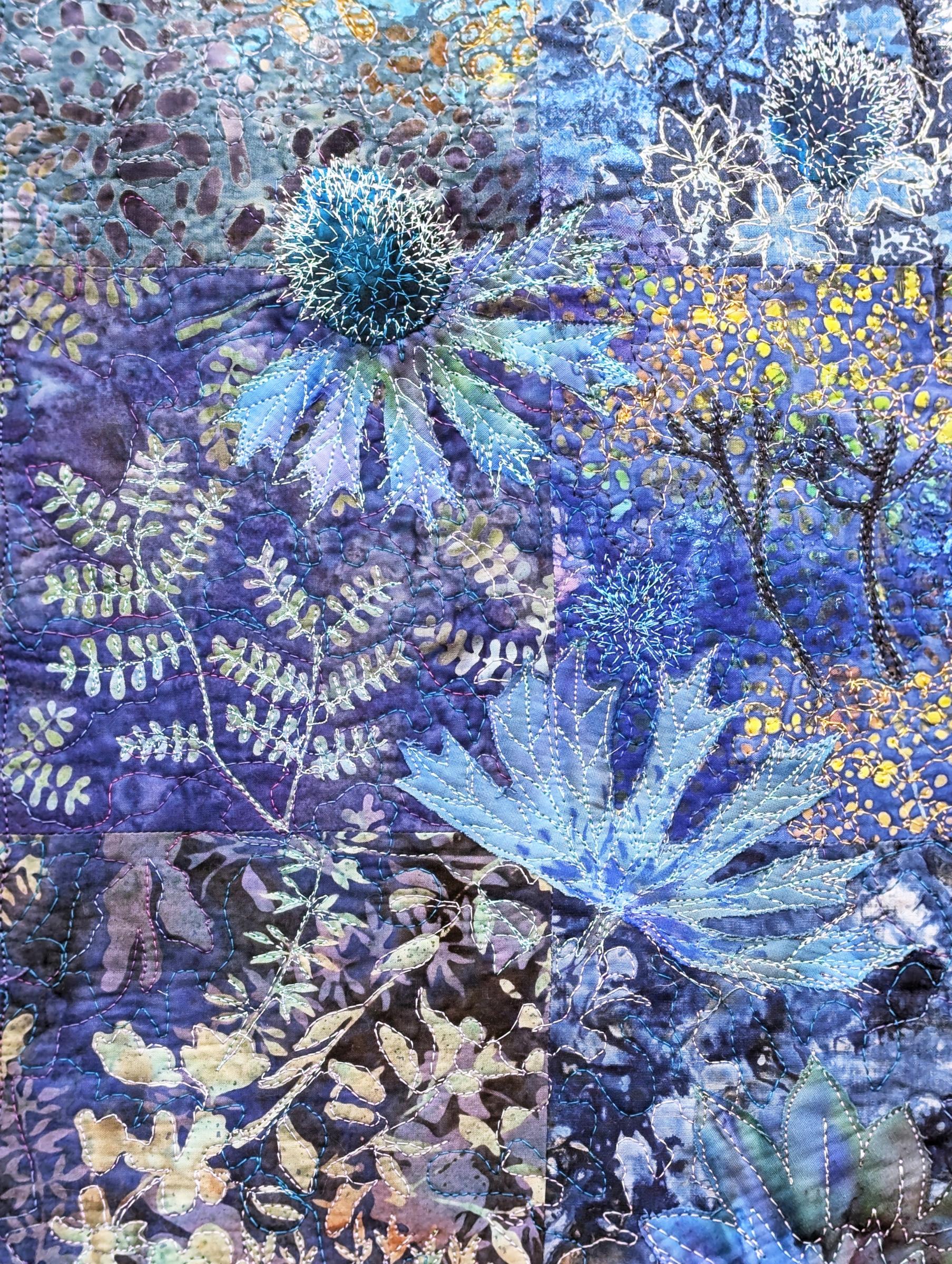 Pieced, raw edge appliquéd, machine embroidered, machine quilted, painted