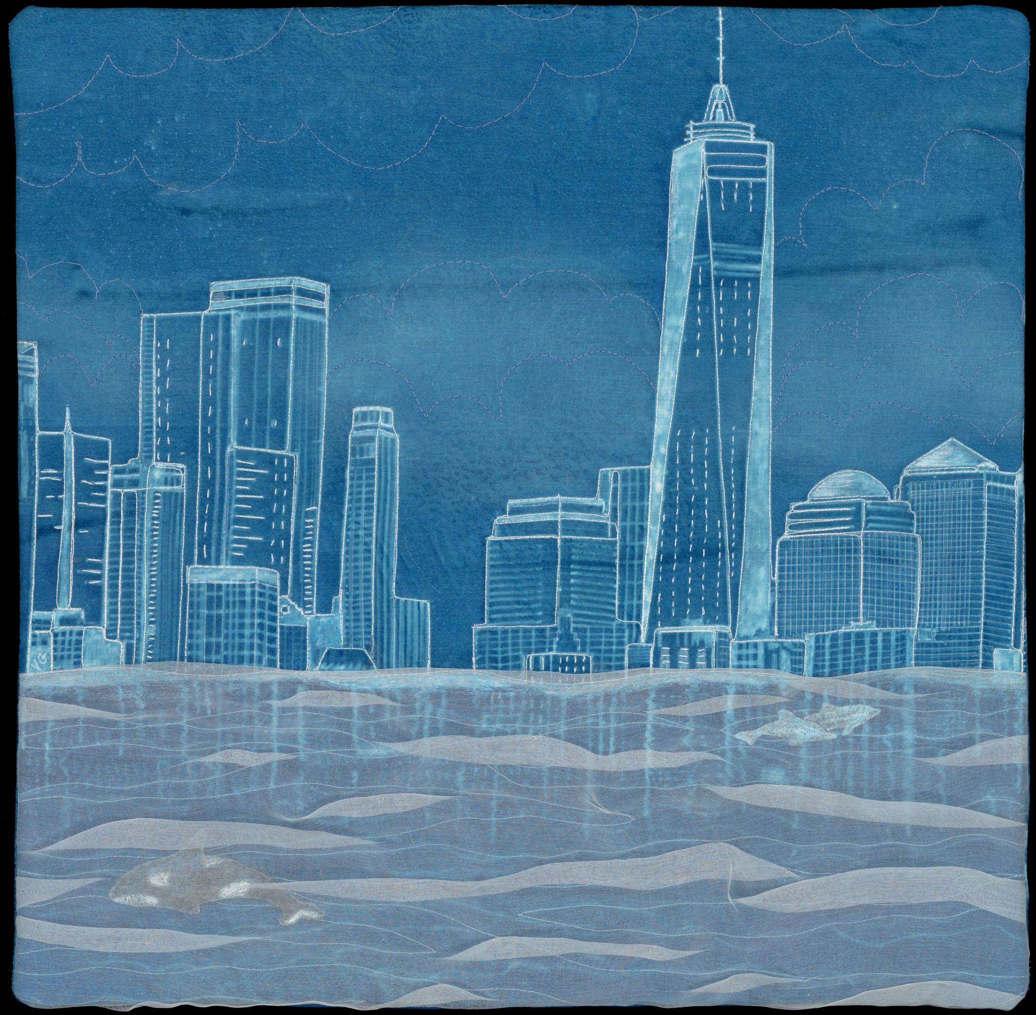 Cyanotype printing process of original ink drawings on clear film, gel pen enhancement, machine stitching & hand stitching