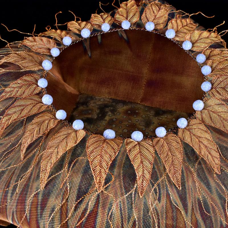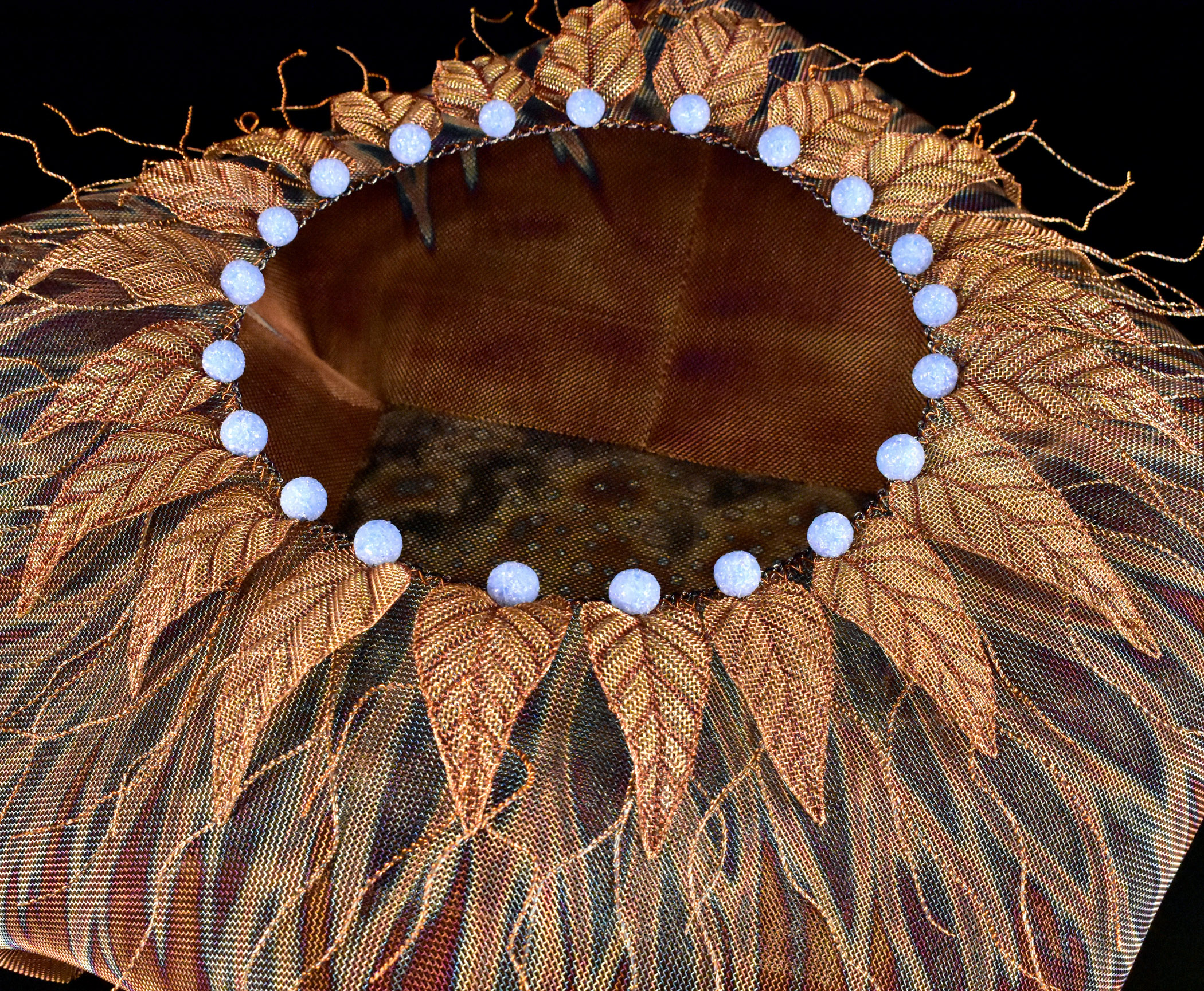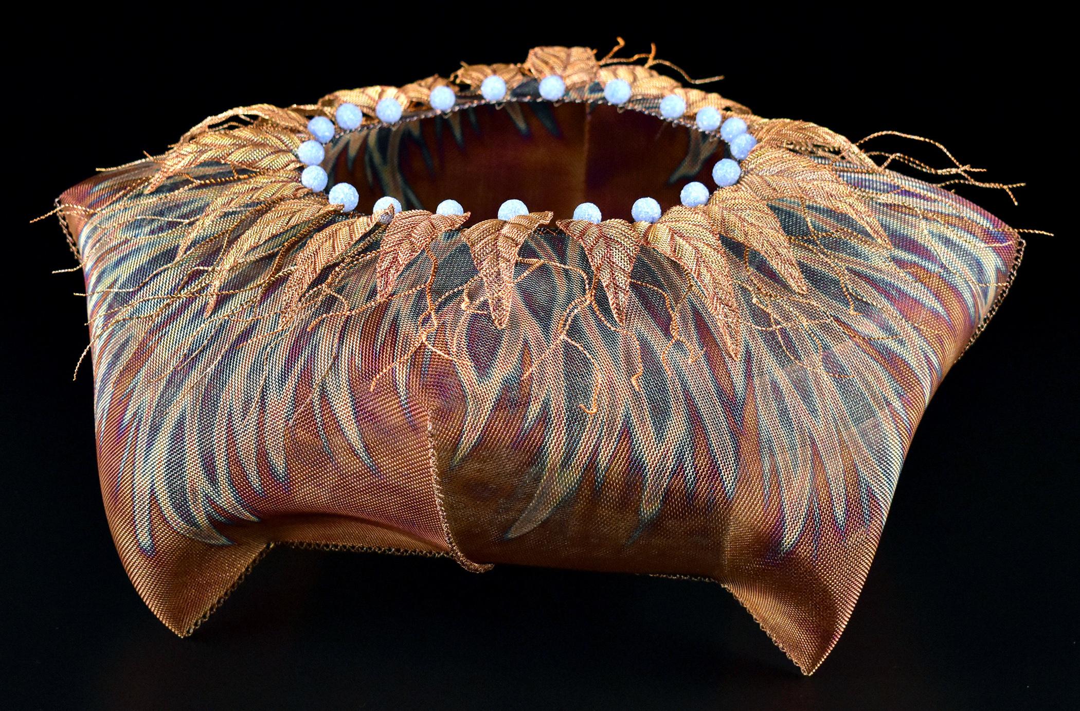 This sculpture was made out of flame-painted, stainless- steel mesh. It was created by twisting edge wires together then hand stitching the seams. Copper leaf and glass frit berry-like forms surround the circular opening.