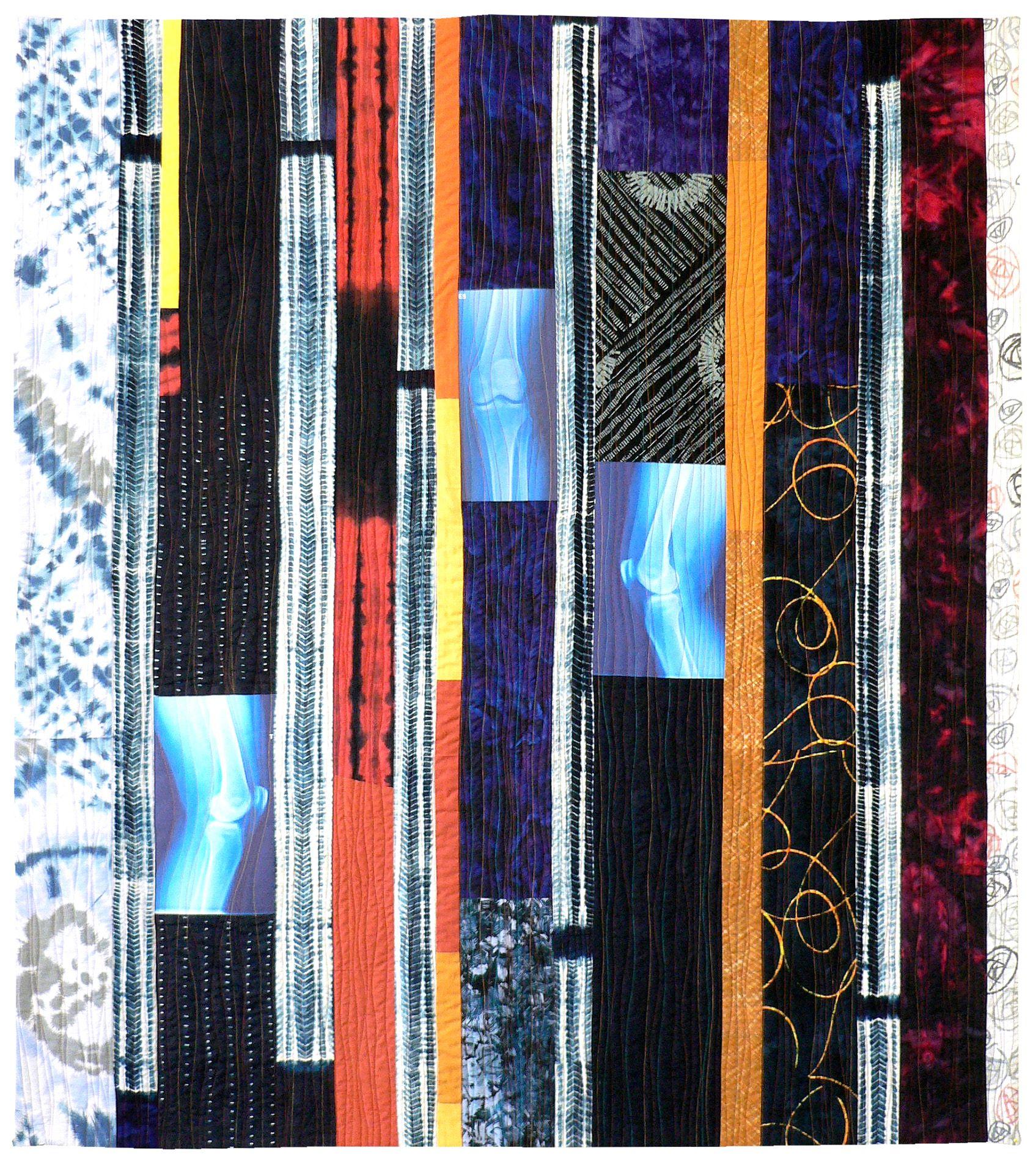 Contrast these impressions of rough, indigo-dyed spinal columns and abstract bones with the elegant X-rays of my knees. Add splashes and swirls of light and color. Much of my work is composed in simple patterns, influenced by early quilt traditions, but with unusual directions. Colors and shapes have a distinct sensibility, often conveying variations in light and movement that appeal to me.