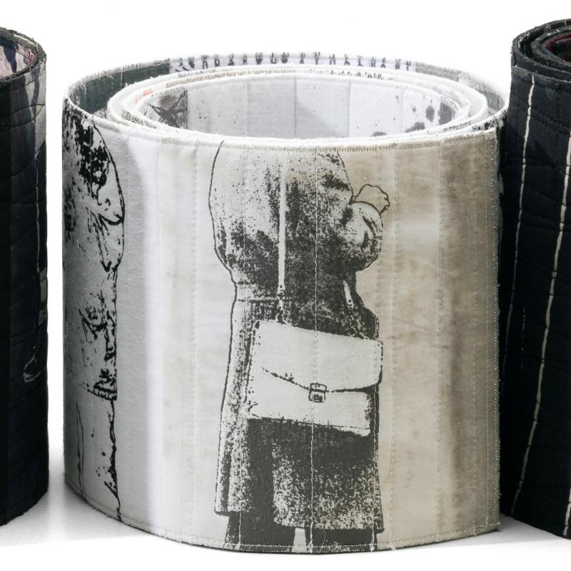 With the pandemic’s erasure of people who retreated behind closed doors or even died, I began working with processes and formats to disappear or change figures. Like wood twist toys, children’s flip-flap books and the drawing game of Exquisite Corpse, Body of Work separates images of people in to parts. As I printed the people, I rearranged to order of feet, torsos and heads on 3 standing scrolls. Like individual pages of a 3-part book or twist toy, when the 3 scrolls interlock as coils, only a few parts are visible and, depending on alignment, combine heads, feet and torsos of different people. (installed dimensions variable depending on configuration, spacing & tightness of coils)