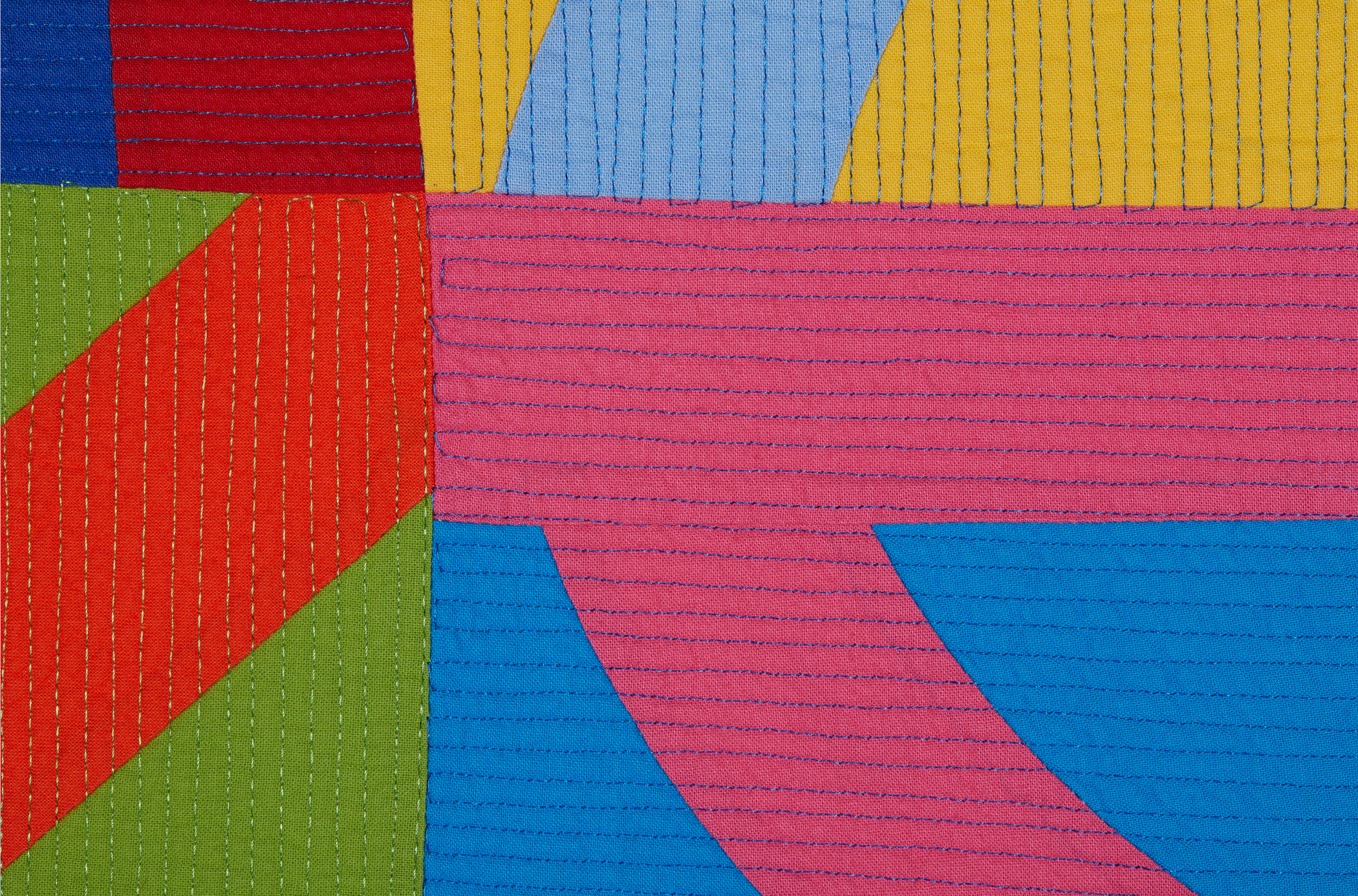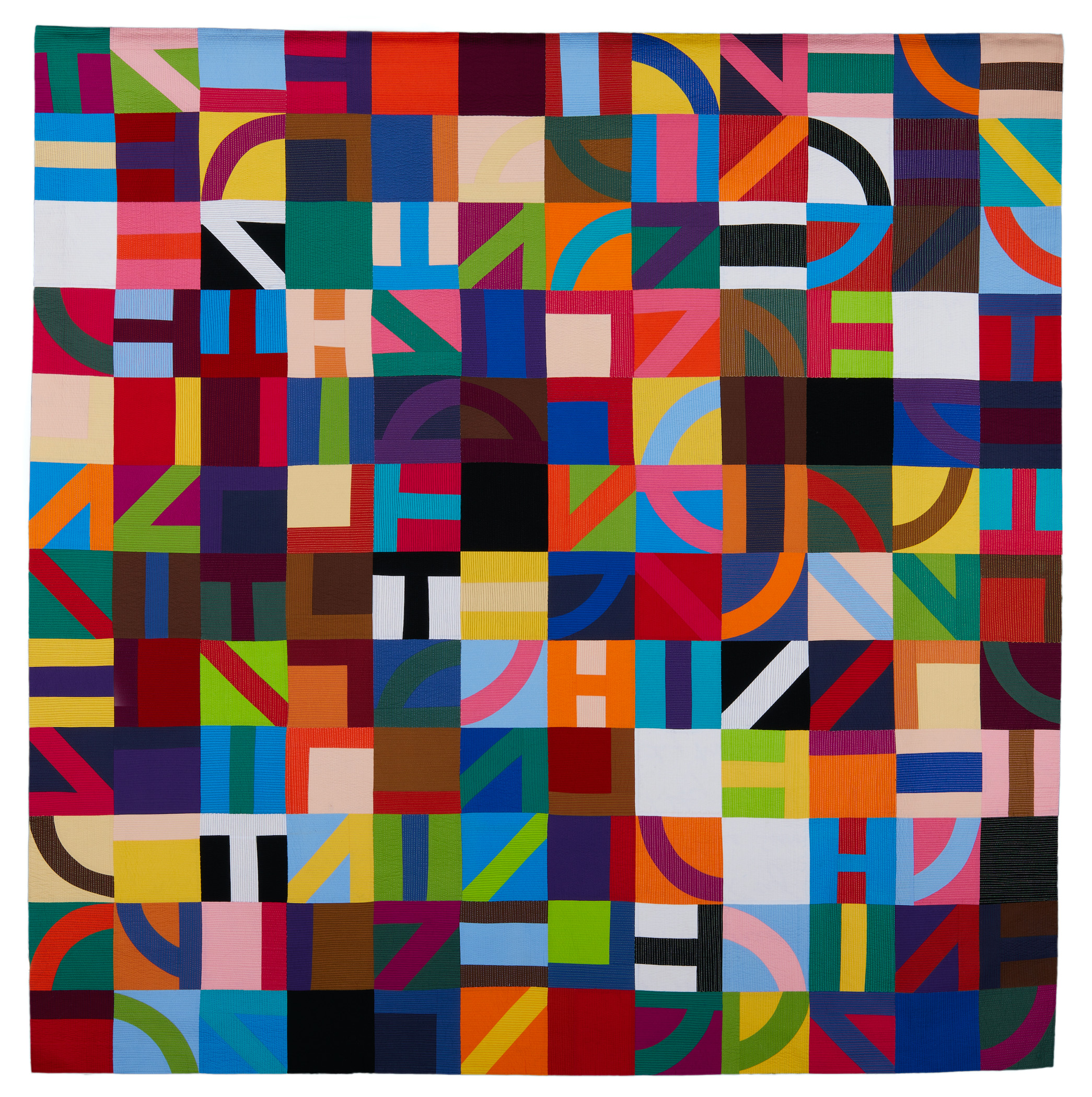 I have always been interested in contemporary art, and this quilt was inspired by the works of Alighiero Boetti artist of the "Arte Povera" movement born in Italy in the second half of the 1960s. Like Boetti I included a couple of his among the signs that are my way of being a textile artist. It is up to the viewer to find them. I chose to use plain-colored fabrics to give more plasticity and graphics to the whole.