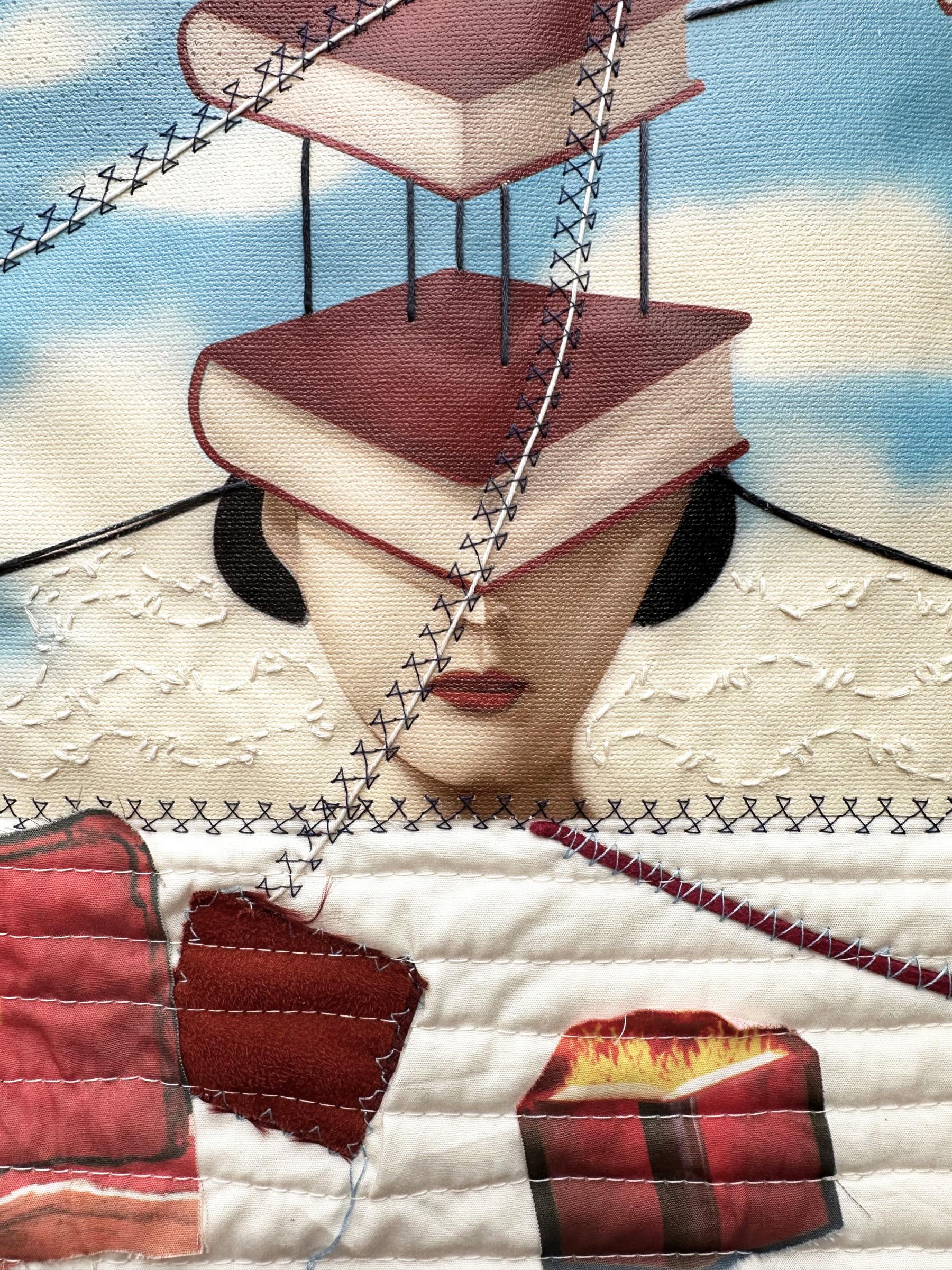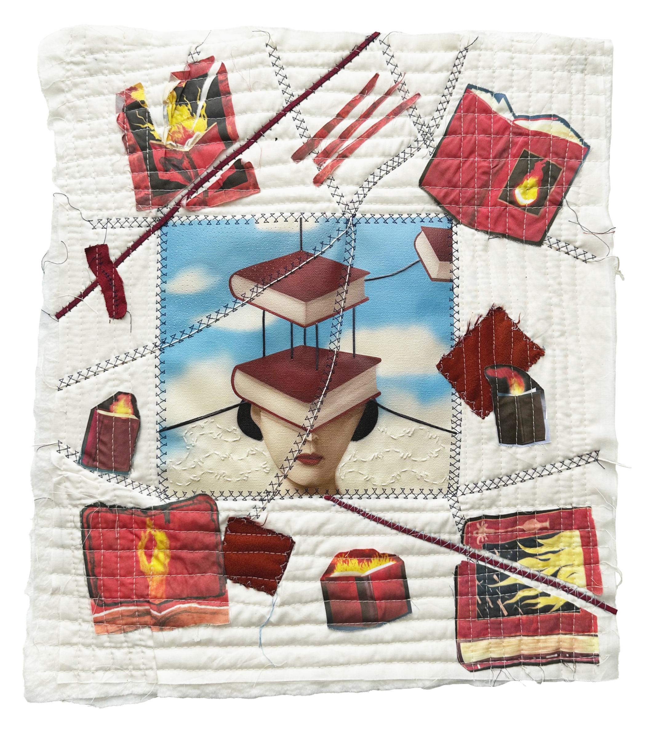 This collage quilt was a reaction to the book bans and burning around the country. AI image generations were used to create its components. The text input for the central image was entered into the 2022 AI image generation program DALL·E. " A Magritte painting of a woman with books attached to her head by strings and floating above her, a far view." As with all AI generations, the initial image required several attempts and later Photoshop cleanup. The red books around the edge were generated from the input text, “burning red leather books in a variety of art styles.” The AI image generation resulted in many options that were not possible without it, including a variety of burning books.