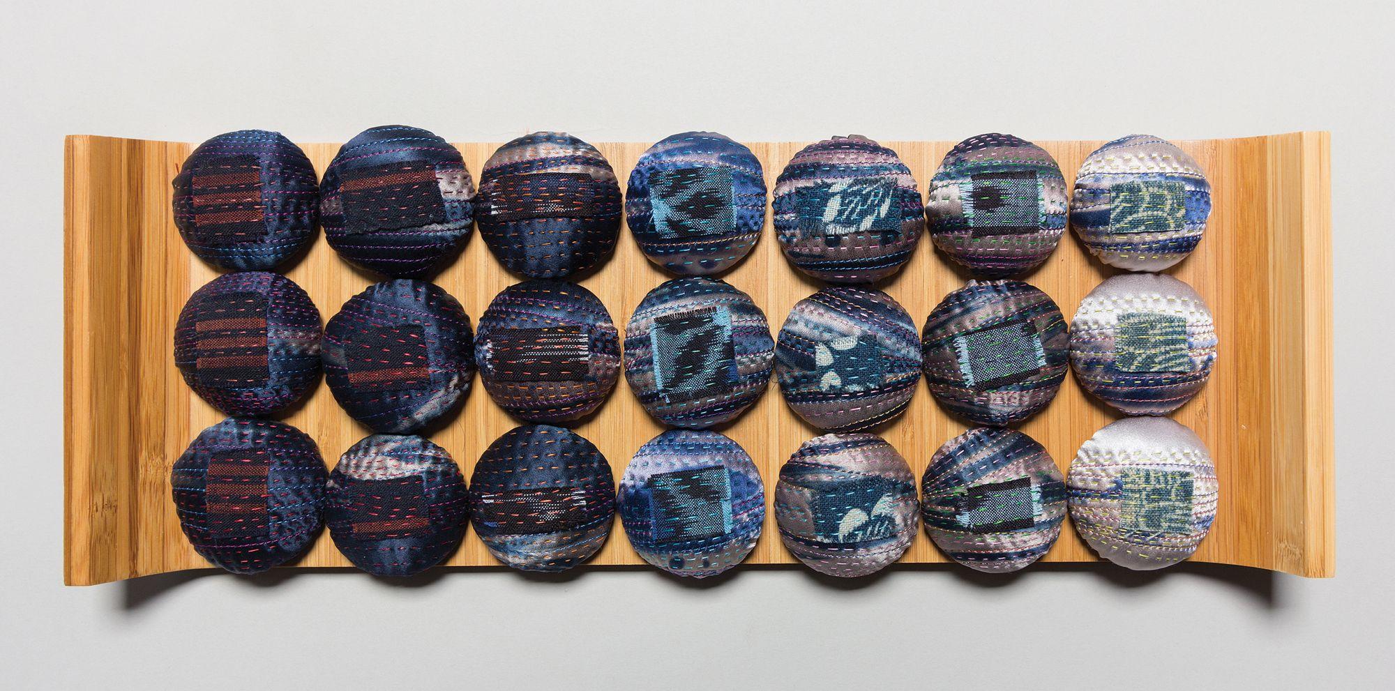 Shibori dyed, discharged, machine stitched, hand stitched, pieced, layered, stuffed